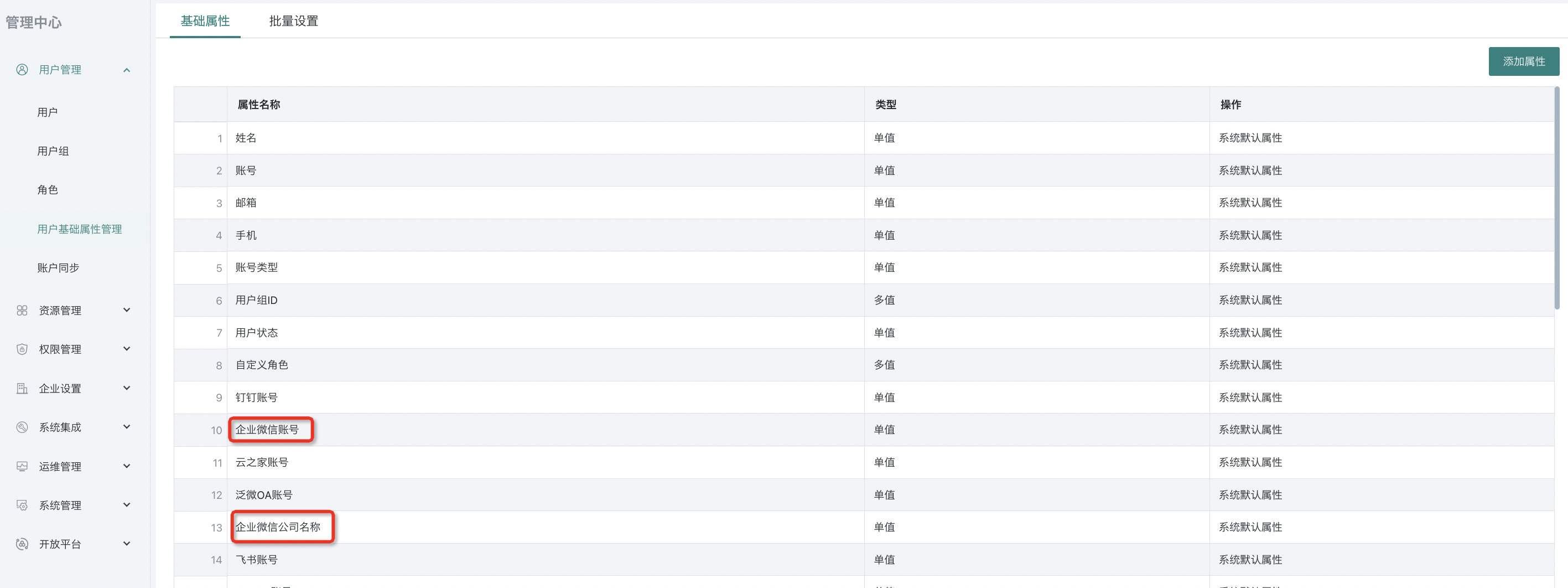 企业微信配置「启用」后,系统会自动添加2个用户基础属性:「企业微信账号」和「企业微信公司名称」。
