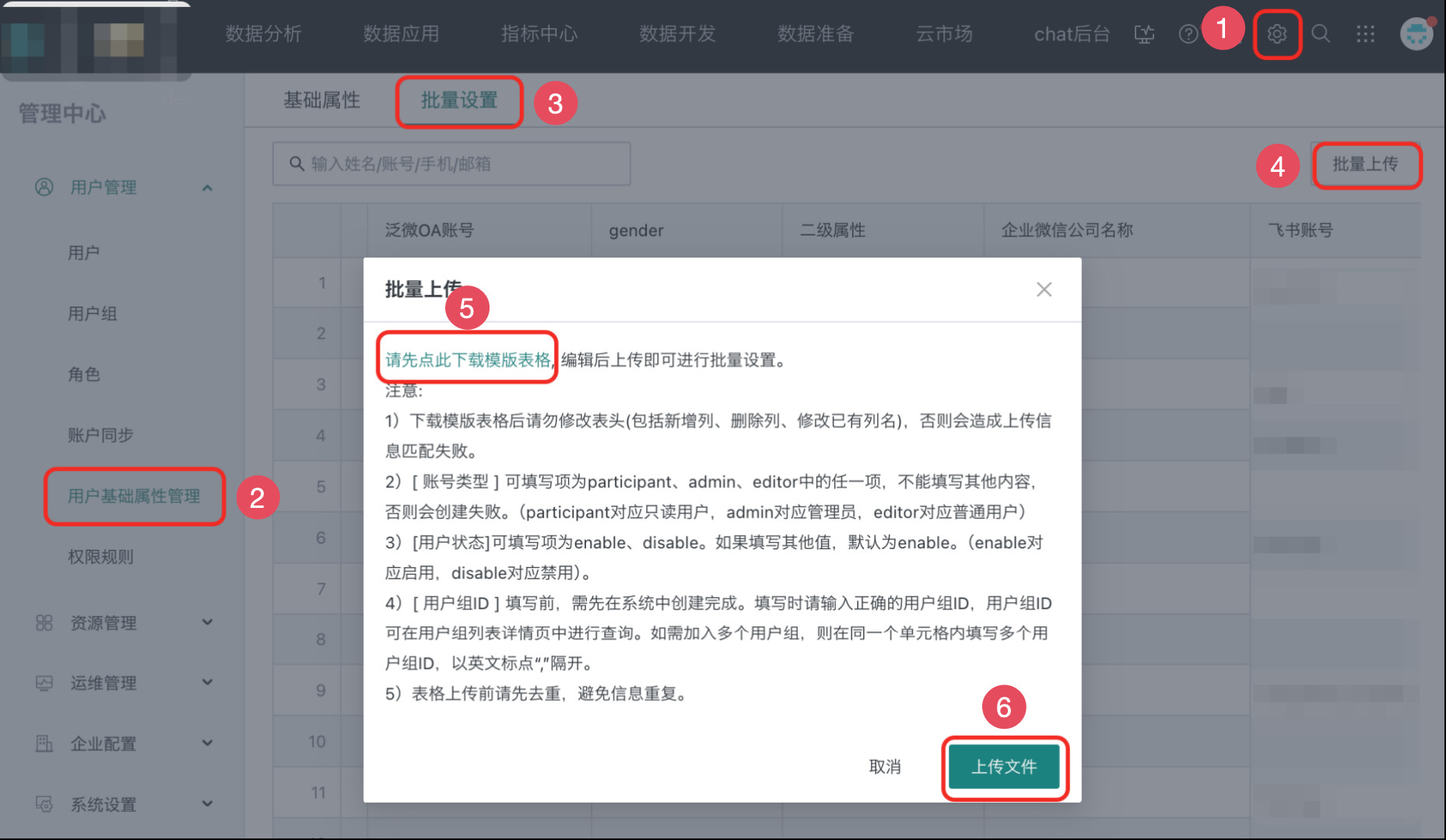 进入观远BI「管理中心> 用户管理 > 用户基础属性管理 > 批量设置」页面,单击「批量上传」,下载模板表格并填写用户对应的企业微信账号信息,完成后上传模板。