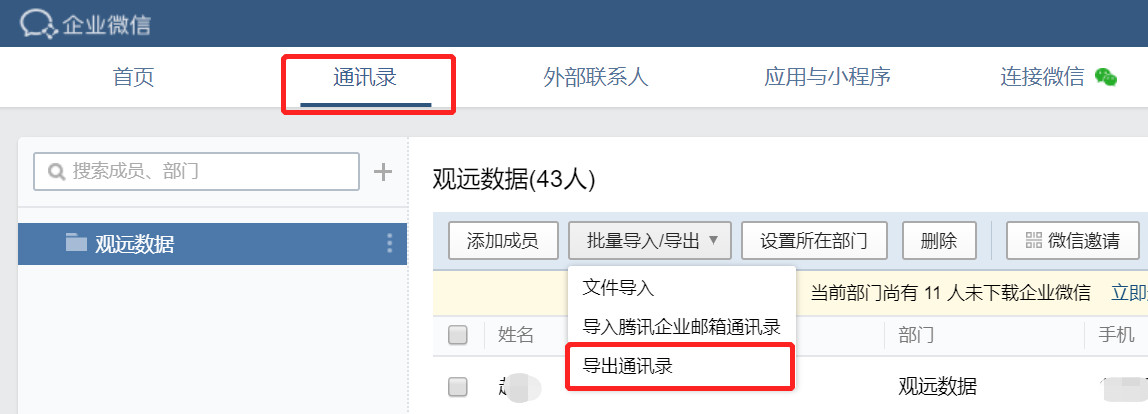 进入「企业微信管理后台 > 通讯录」, 选择「批量导出 > 导出通讯录」,批量导出用户的企业账号信息。