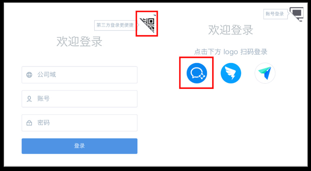 PC端登录页面出现企业微信登录入口,点击后可扫码登录。