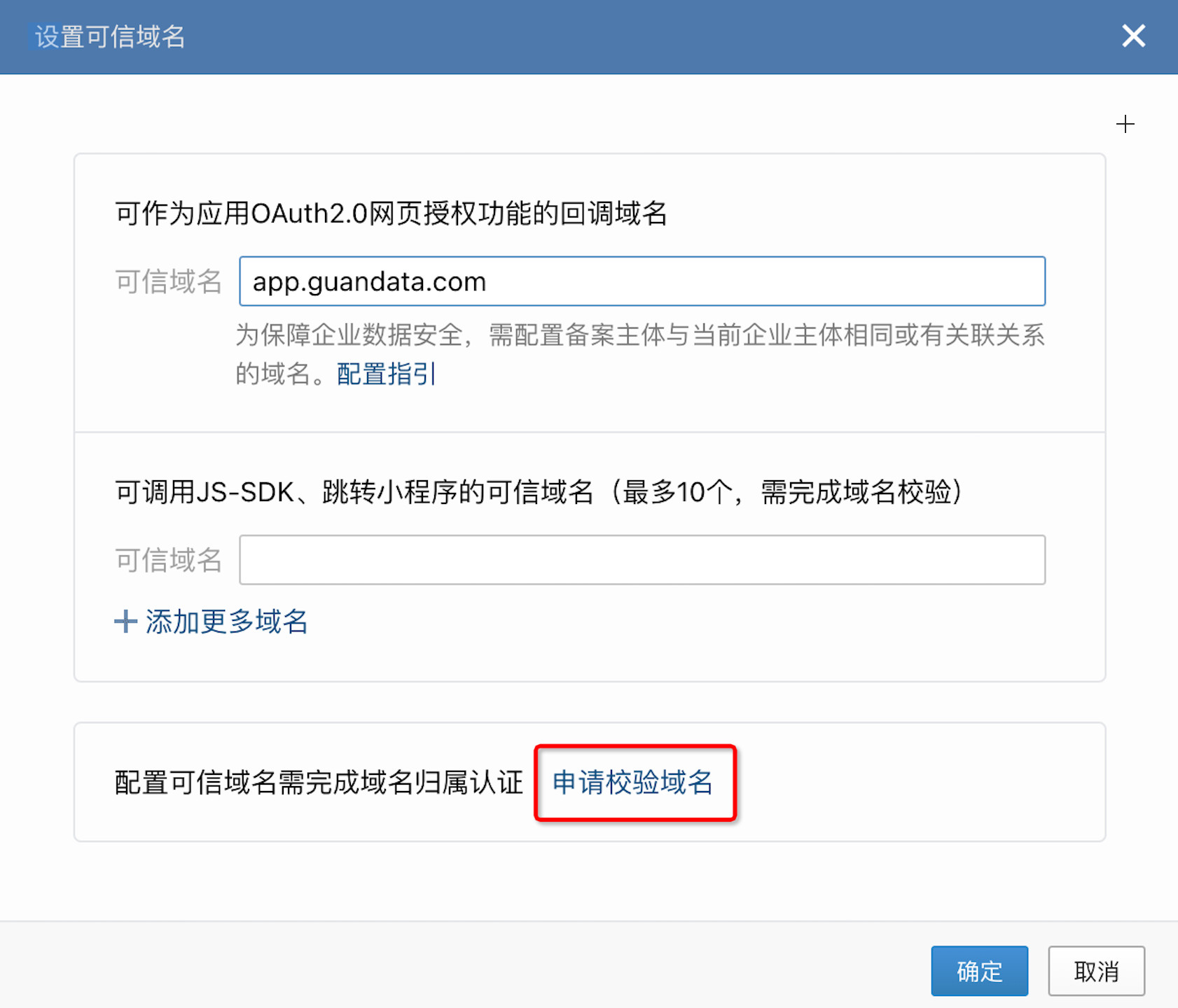 如为本企业域名,则需完成域名企业主体认证,配置入口如下,配置方法见https://open.work.weixin.qq.com/help2/pc/15023?person_id=1;