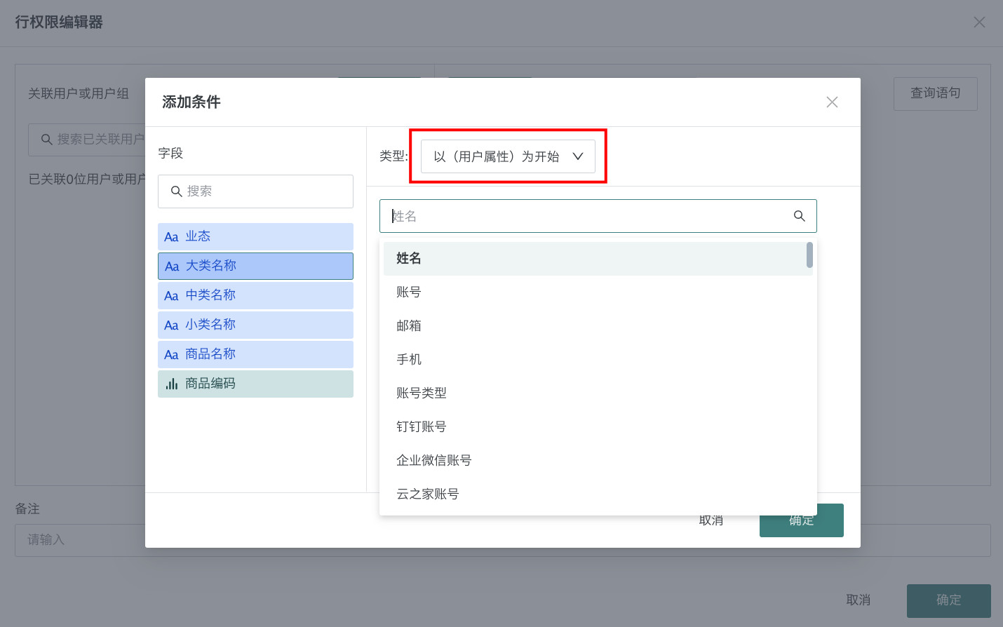 以(用户属性)为开始:当字段值以某个用户属性值为开头时,可在右侧选择对应的属性;该类型适用于具有层级前缀规则的字段,如下级部门名称等(如部门 “A.C” 以 “A” 为开头)。