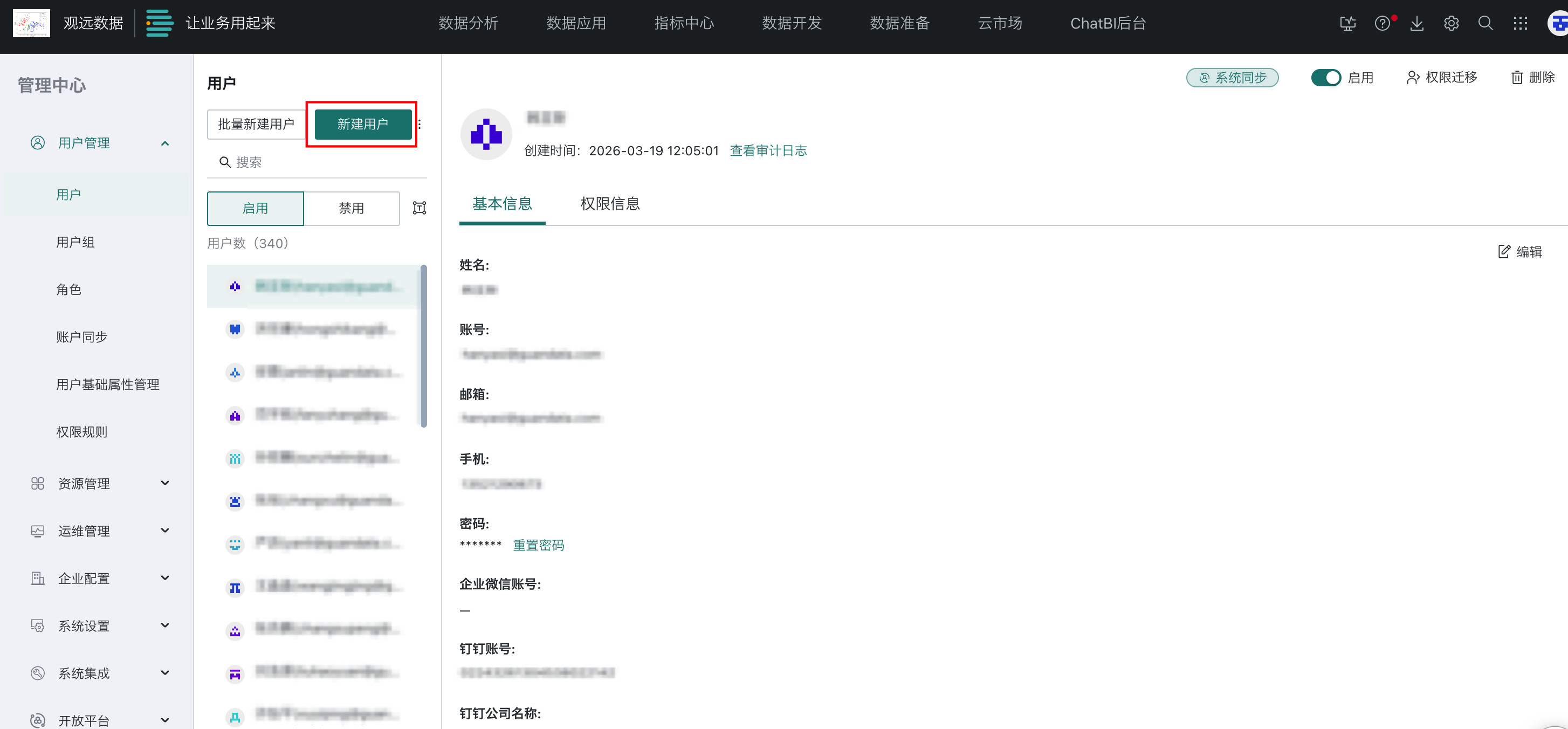 单独添加:进入「管理中心 > 用户管理 > 用户」页面,点击「新建用户」即可创建一个企业成员,详细操作可参考单个创建用户。