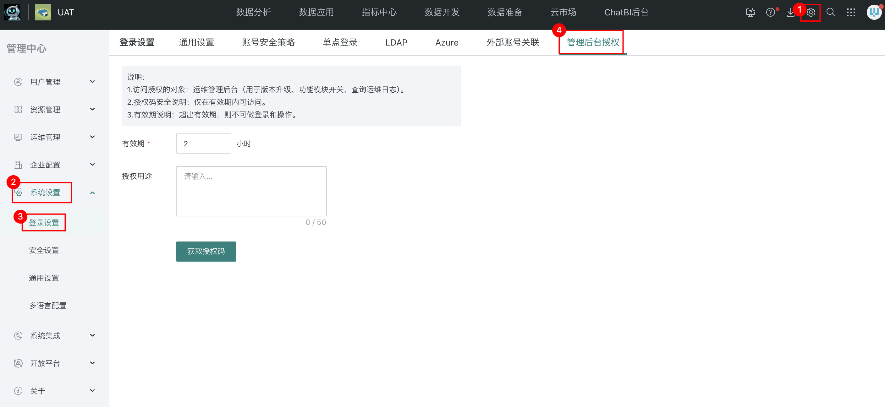 授权路径:管理中心 > 系统设置 > 登录设置 > 管理后台授权