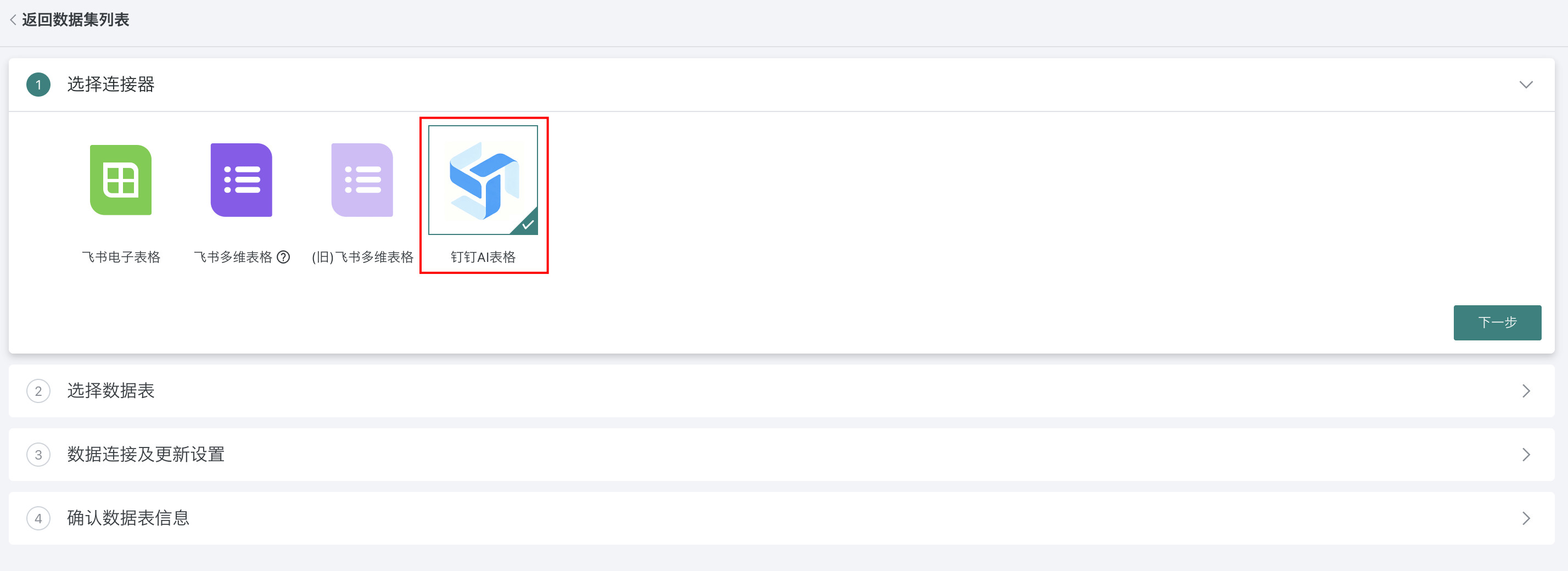 - 新接口连接器(建议优先选择):7.1 及以上版本支持对接飞书多维表格新接口,目前仅支持数据表及收集表两种类型的接入。为保障数据连接查询服务稳定,建议在新建数据集时优先选择此连接器。