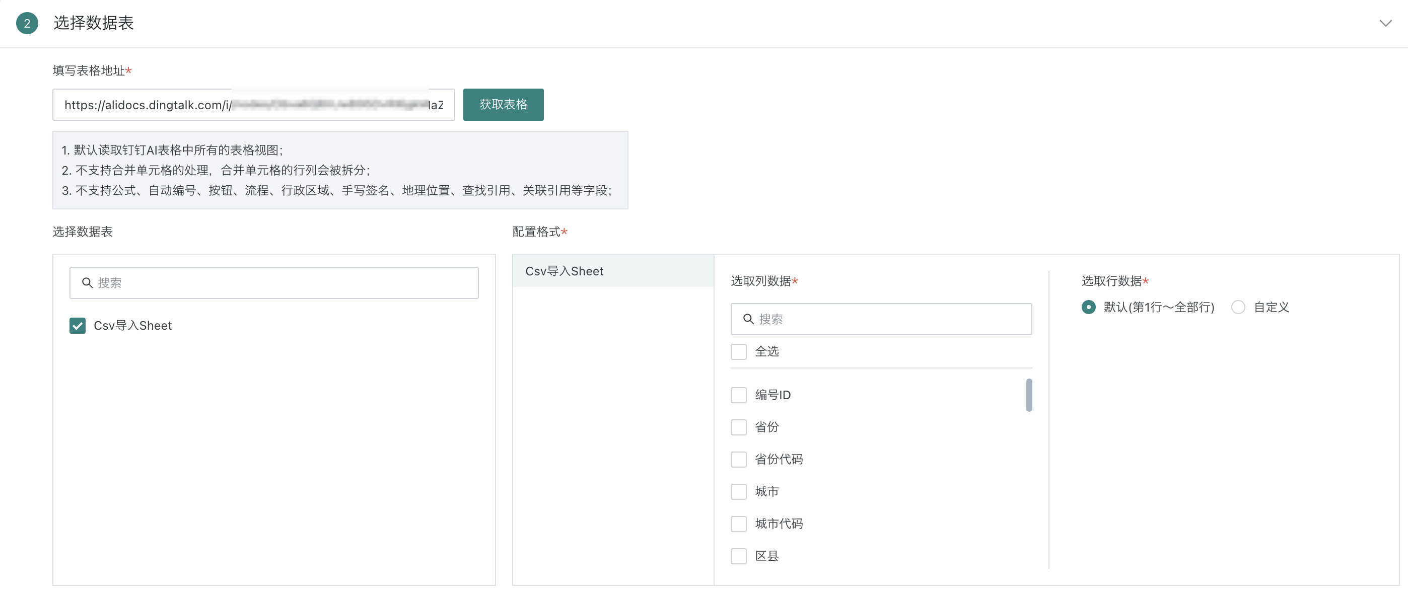 对于飞书电子表格,获取表格后需设置待接入的 sheet 工作表以及目标行列范围。