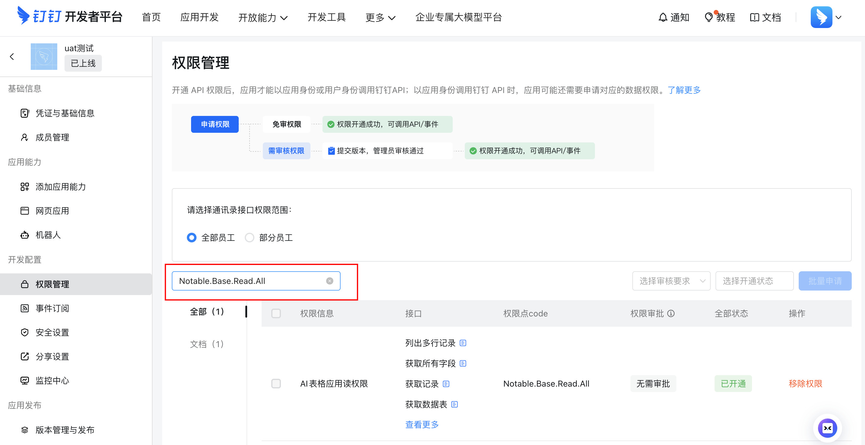 进入钉钉的开发者平台-权限管理页面,开启「AI表格应用读权限」。