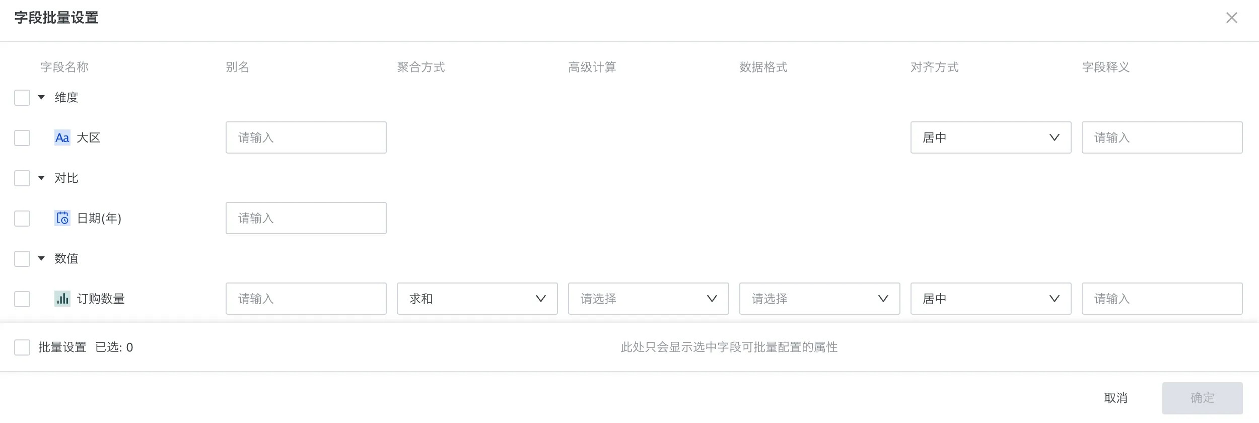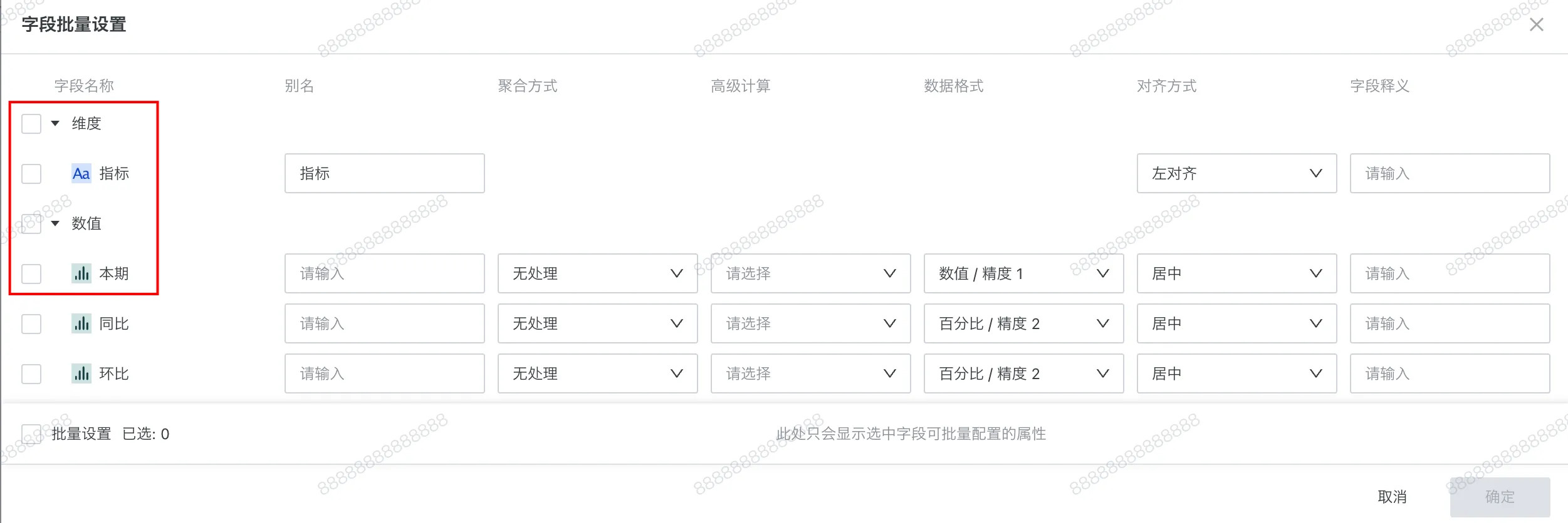 不同的字段分组也提供不同的批量设置的内容,例如维度和数值: