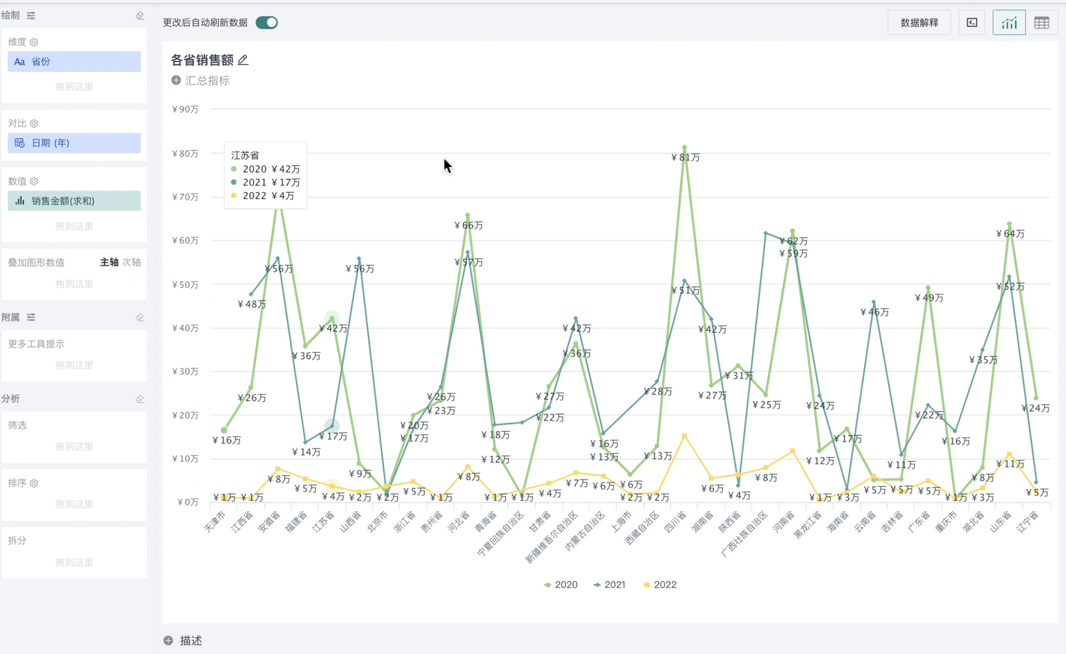 例如在下图中,未设置工具提示时,鼠标移到柱子上只能显示省份和销售金额。设置工具提示后,同样单柱图,鼠标移动到柱子上时,可以展示当前维度的更多信息。