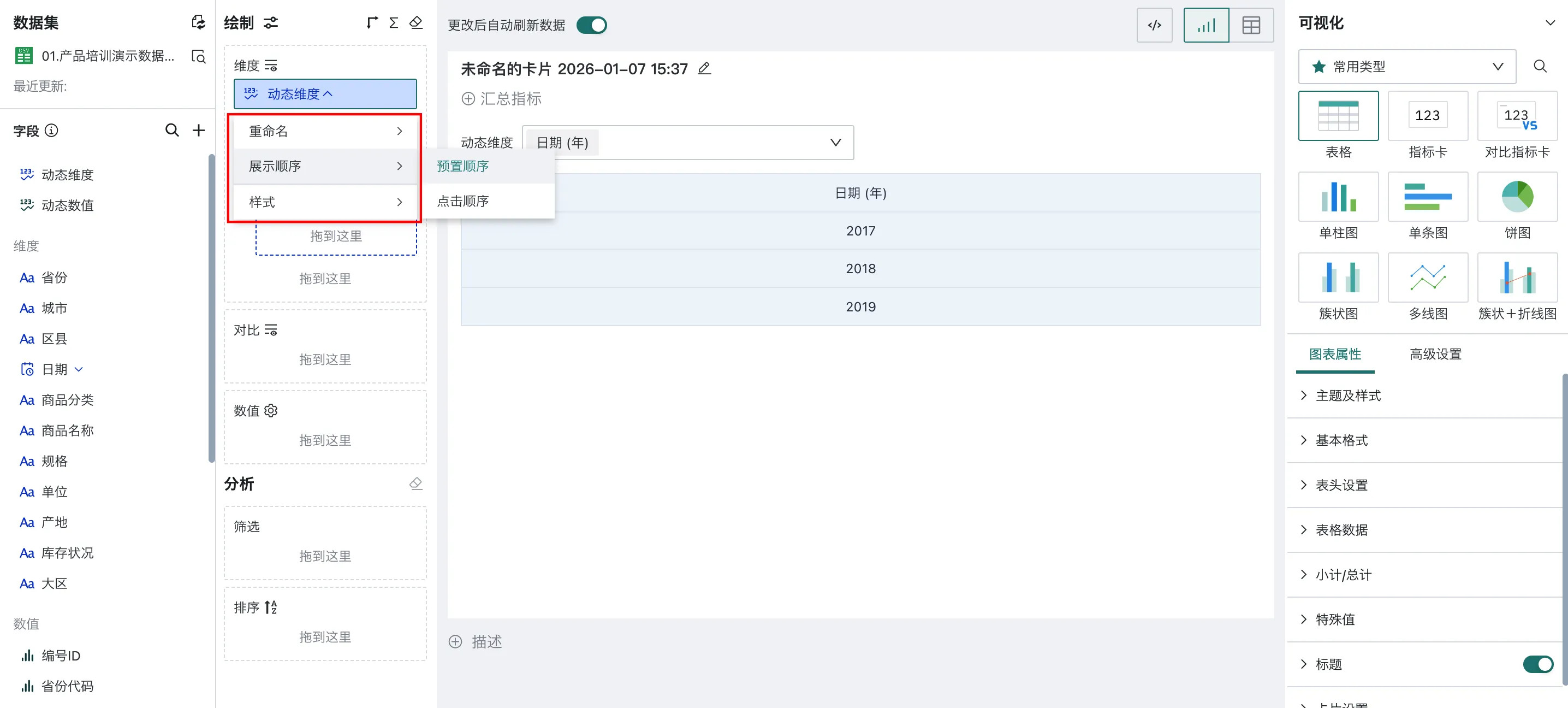 - 「预置顺序」为动态维度/动态数值在图表查看时按照图表制作者在绘制区设置的顺序展示;