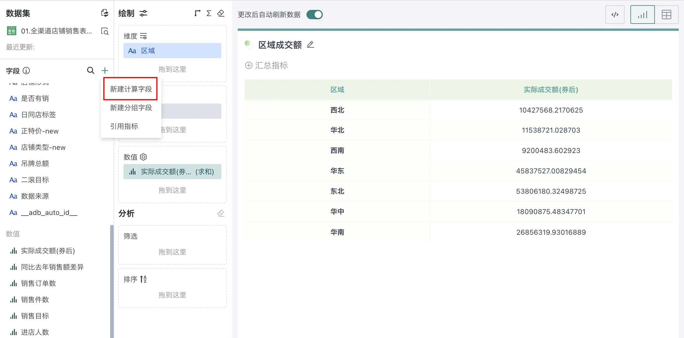 在绘制图表时,若现有的字段无法满足用户的使用场景,用户可以通过新建计算字段来获取所需要的指标。