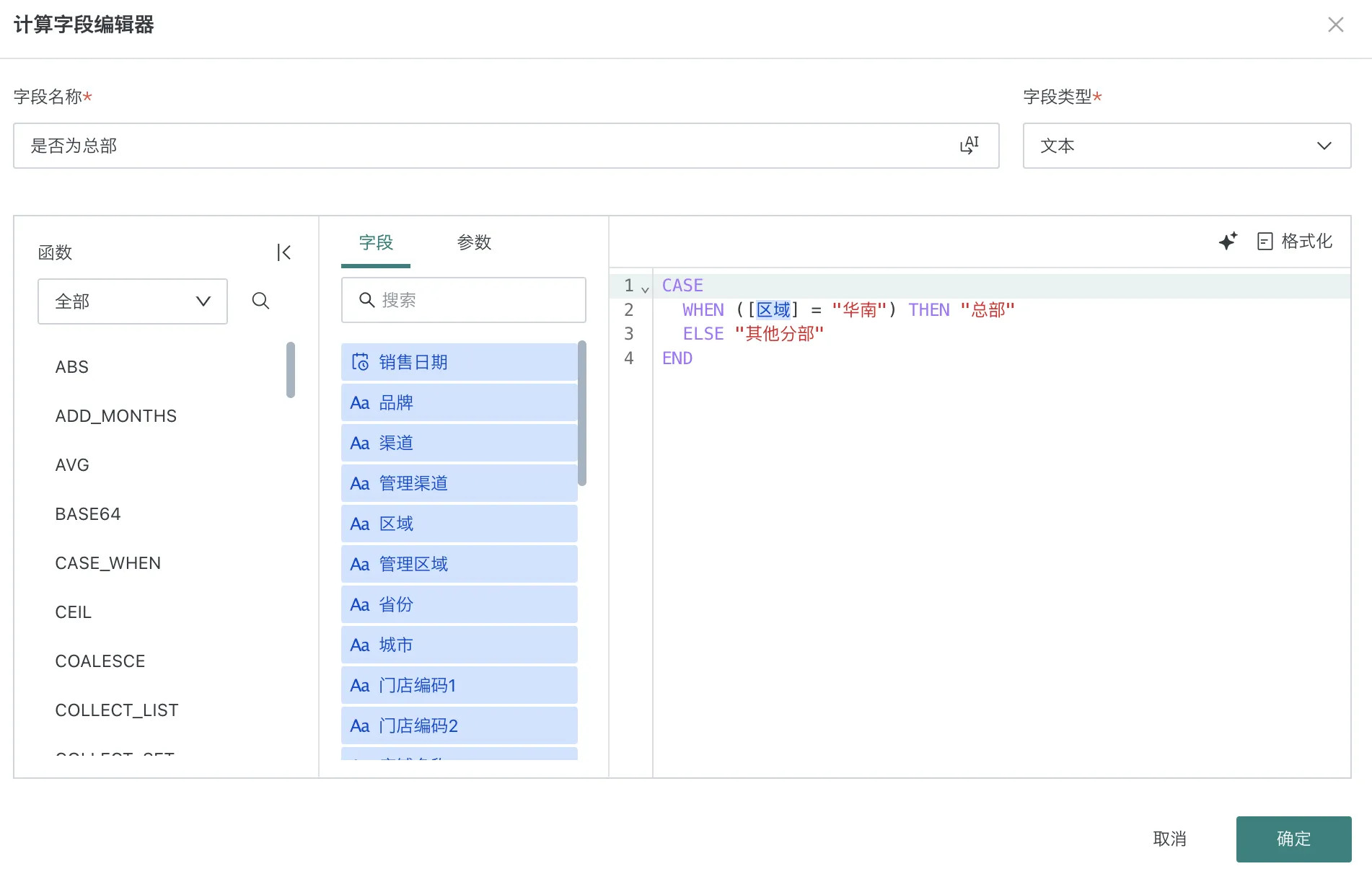编辑计算字段信息及公式:字段名称输入「是否为总部」,字段类型选择文本,字段公式输入case when函数,详细公式如下:
