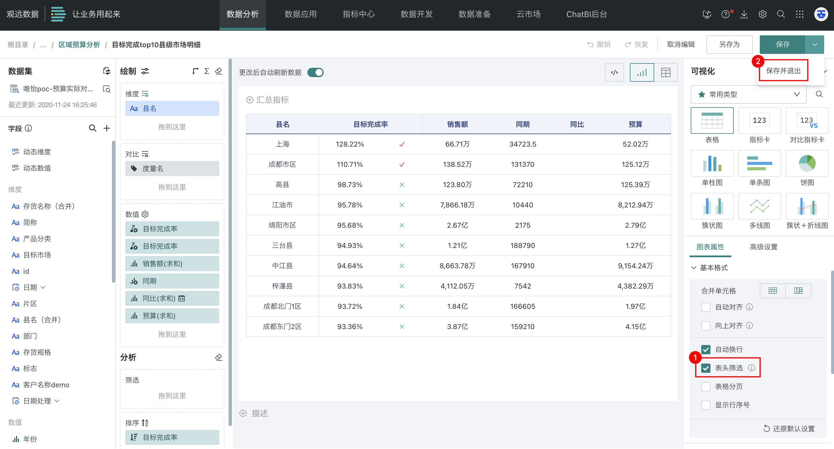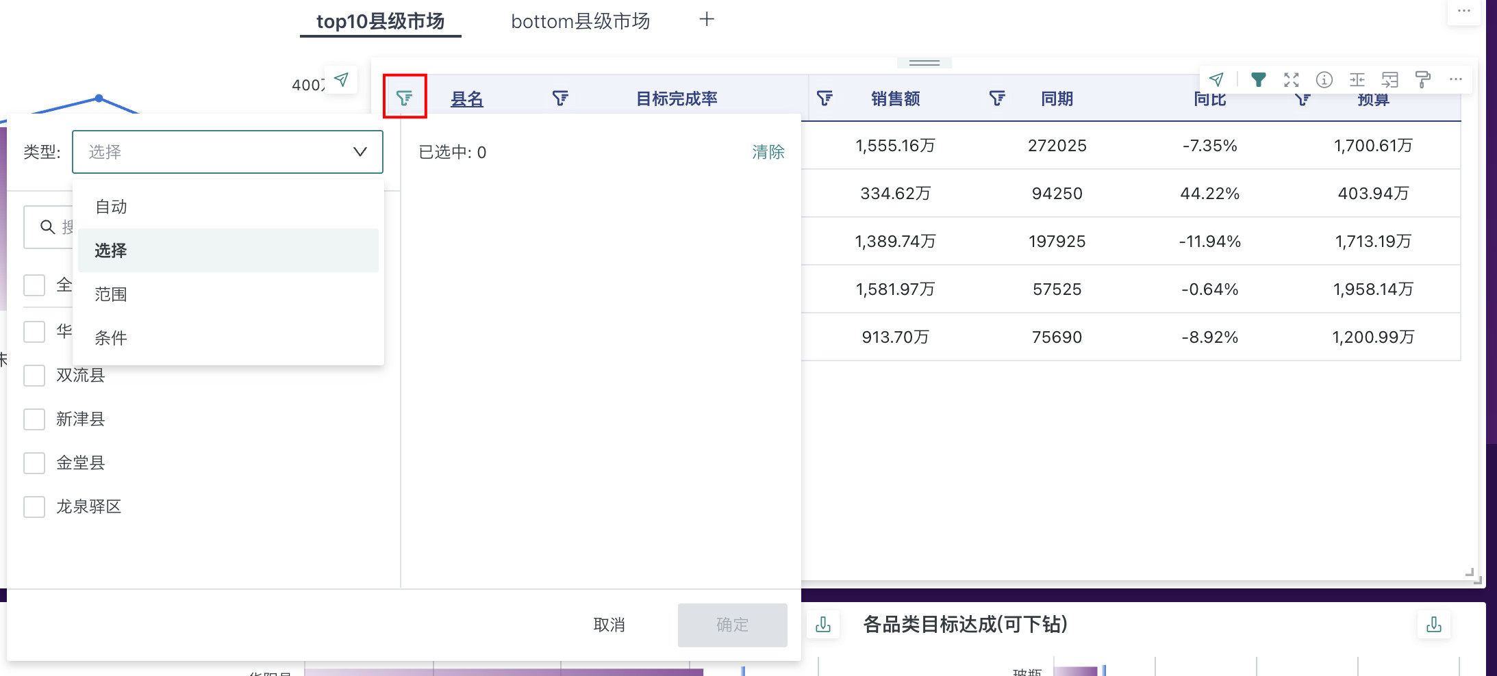 开启「表头筛选」后,点击「保存」退出后即可在仪表板页面使用表头筛选功能,用户无需通过创建多个筛选器实现表格数据筛选。