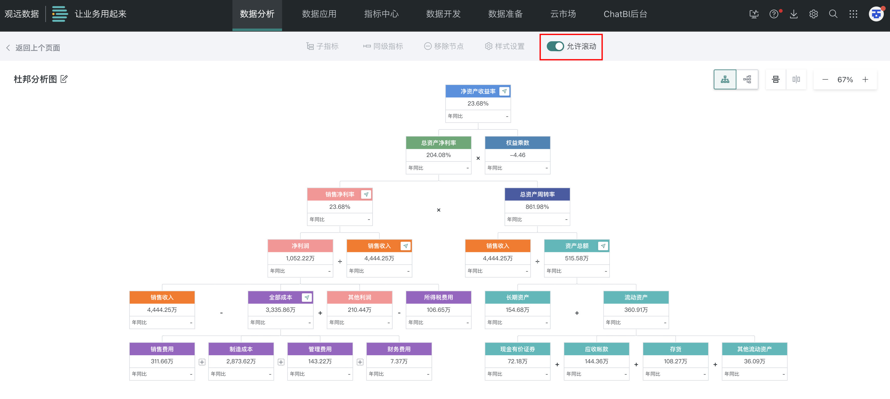 - 开启时,鼠标移入画布内,杜邦分析图支持滚动,滚动范围不超过杜邦分析图边界。