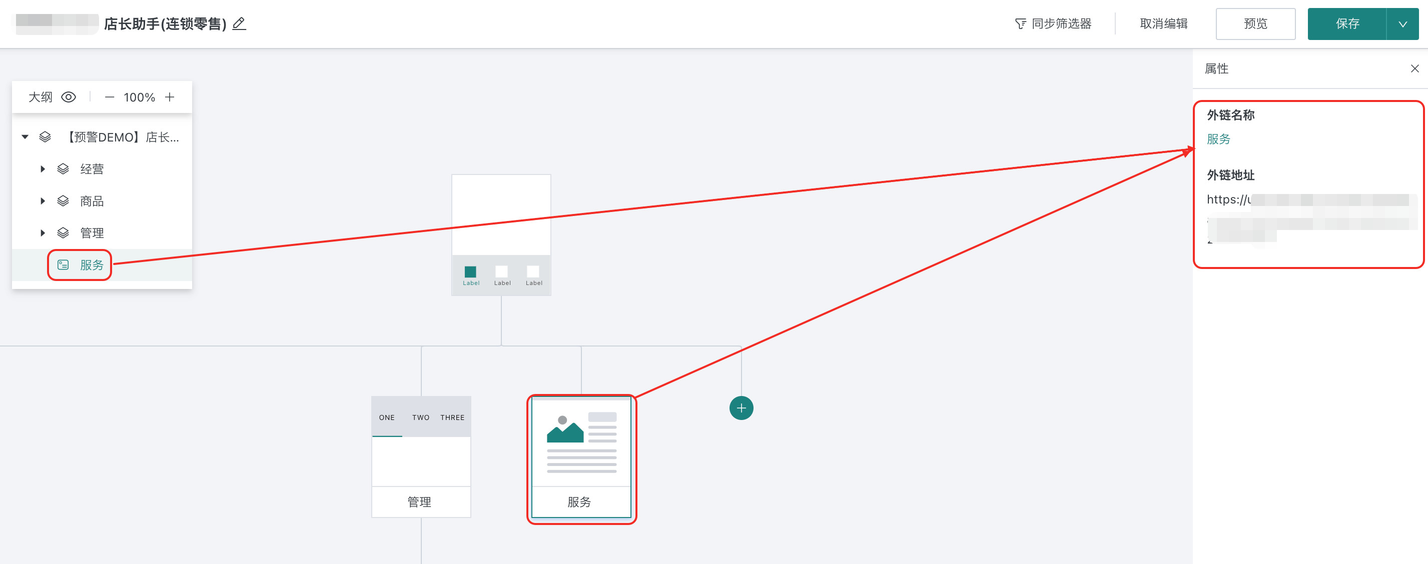 在大纲/画布中点击该节点,可在页面右侧弹出的属性窗口查看外链详情。同时,在此处点击该外链节点的名称,可以直接跳转到外链地址。