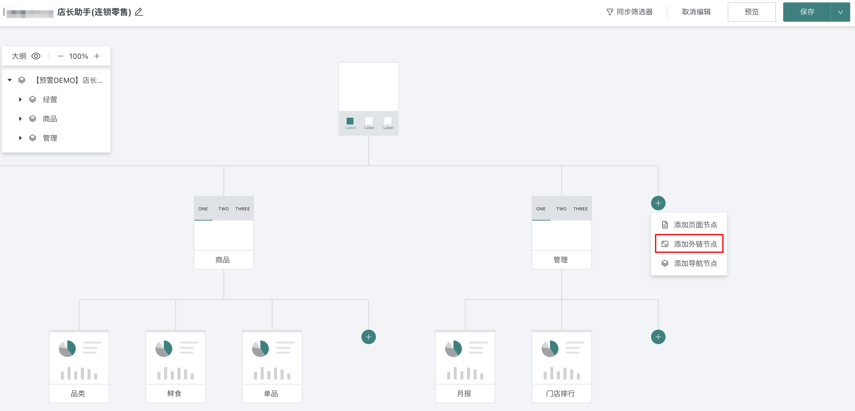 - 一个轻应用可以包含多个页面,针对特定分析场景的轻应用,页面之间是有机联系的,而不是简单堆叠。 因此,在创建轻应用之前,需要对这些页面进行结构整理,例如梳理出如下结构。