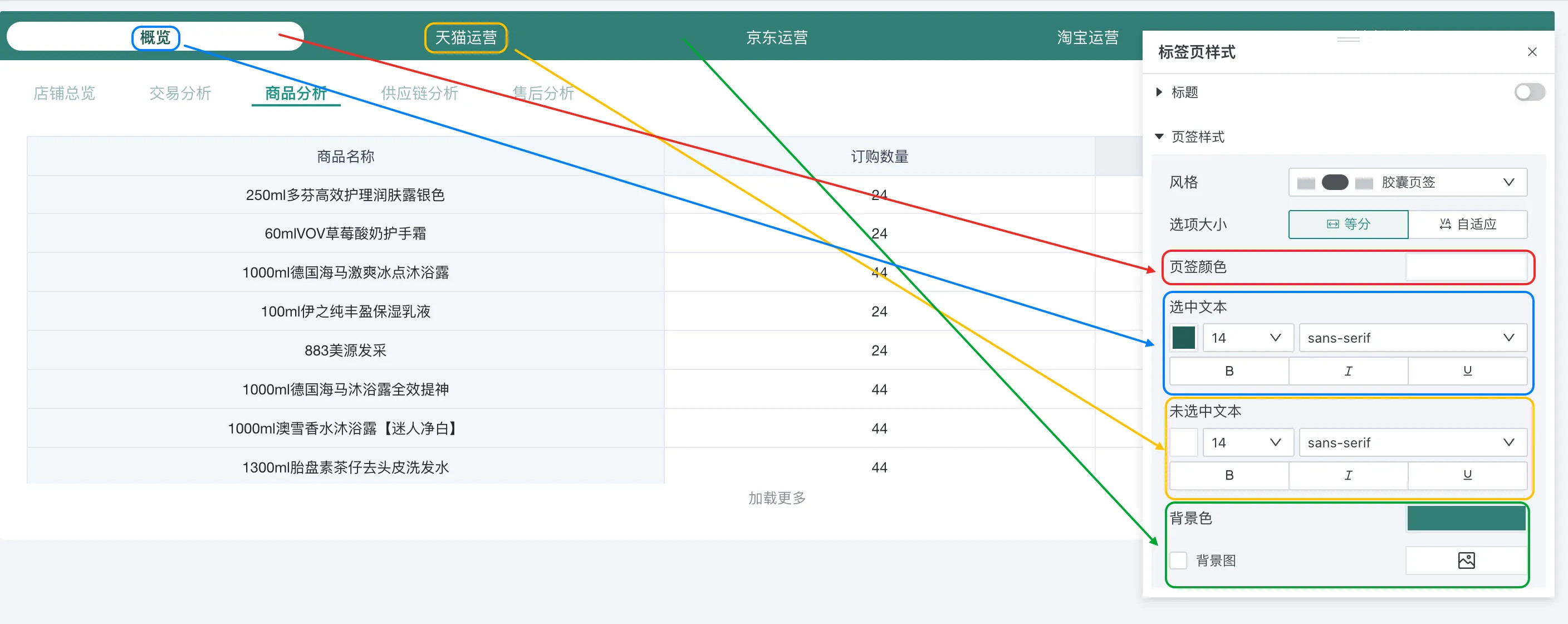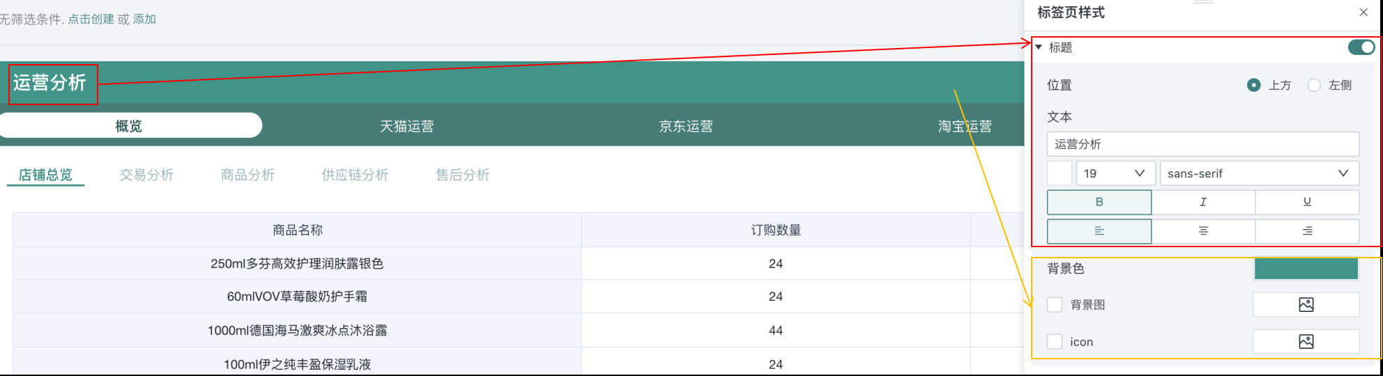| 样式 | 支持配置标题的位置、样式和背景,还支持调整所有页签的风格、样式与背景。![]() ![]() |