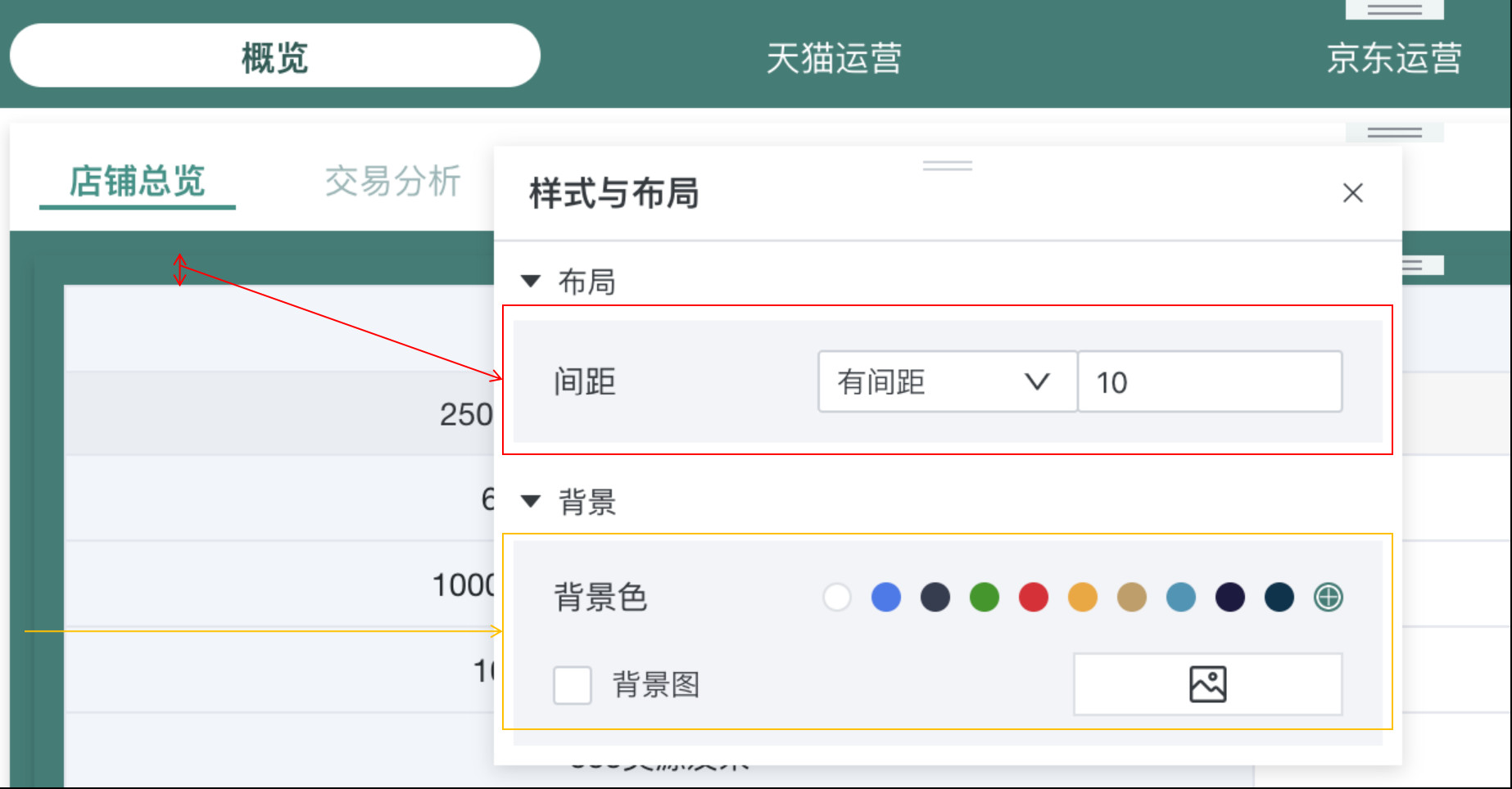 其中,平铺指标组操作略有不同。如果在页面中添加了平铺指标组,点击布局中的卡片,右侧会显示样式配置栏,可进行如下配置: