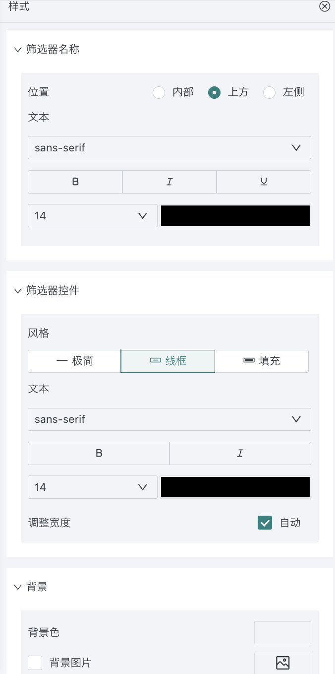 | 样式 | 支持对筛选器组内的筛选器统一配置样式,实现组内筛选器视觉风格的一致性。 ![]() 实现效果: ![]() |