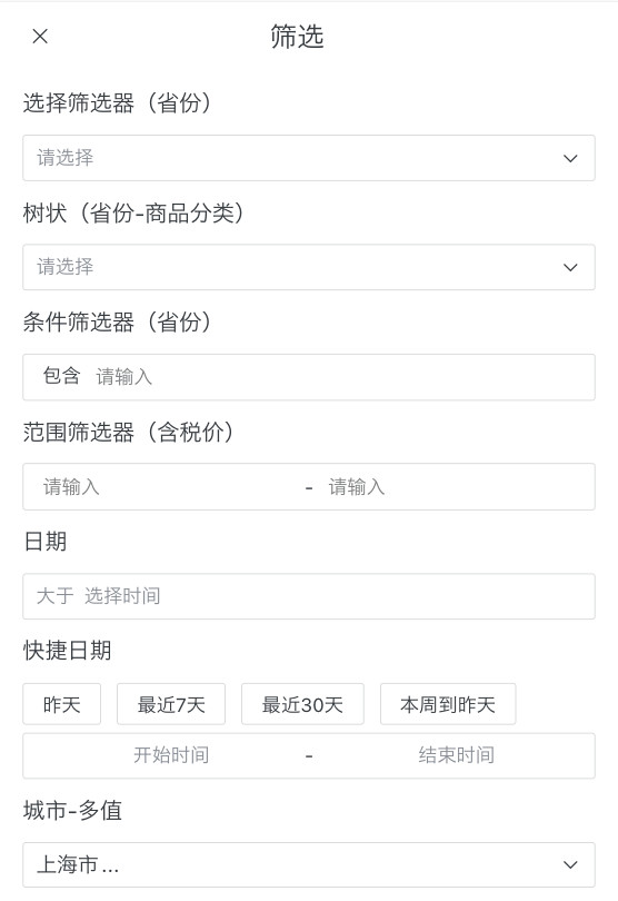 | 筛选器组 | 移动端需要提供多条件筛选功能时 | 按时间、地区、产品类别等多维度筛选销售数据 |