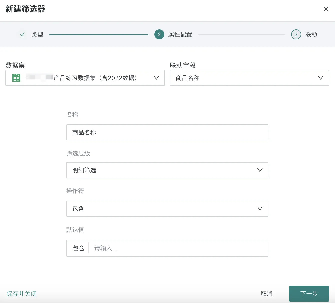 设置条件筛选器时首先选择来源数据集,再选择需要让消费者筛选的字段。