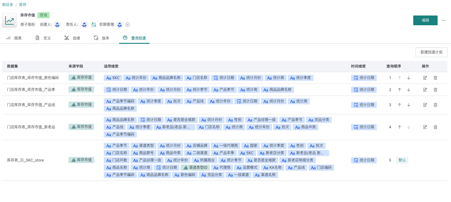 原则上指标在明细表上创建,配置足够全的适用维度。关联查询加速的表为该表的汇总表/降维表。