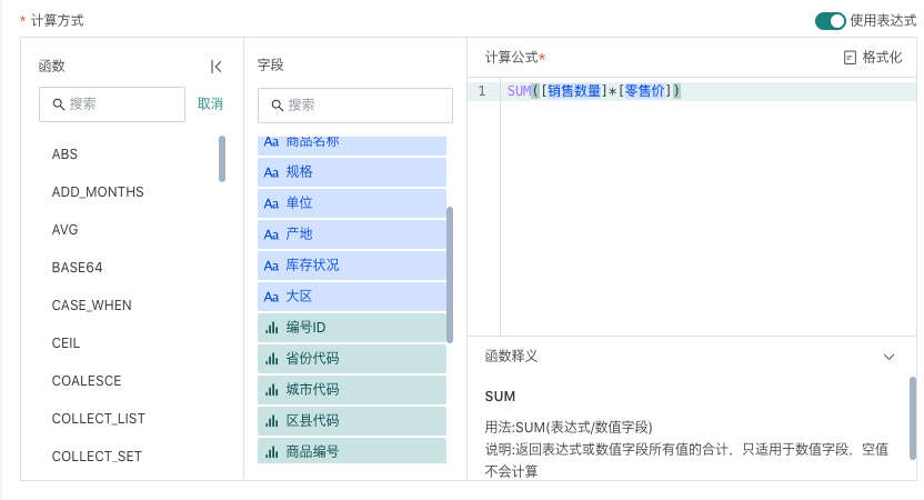 • 使用表达式:使用自定义表达式定义指标的聚合结果,可以引用当前选中数据集的字段先进行明细计算。