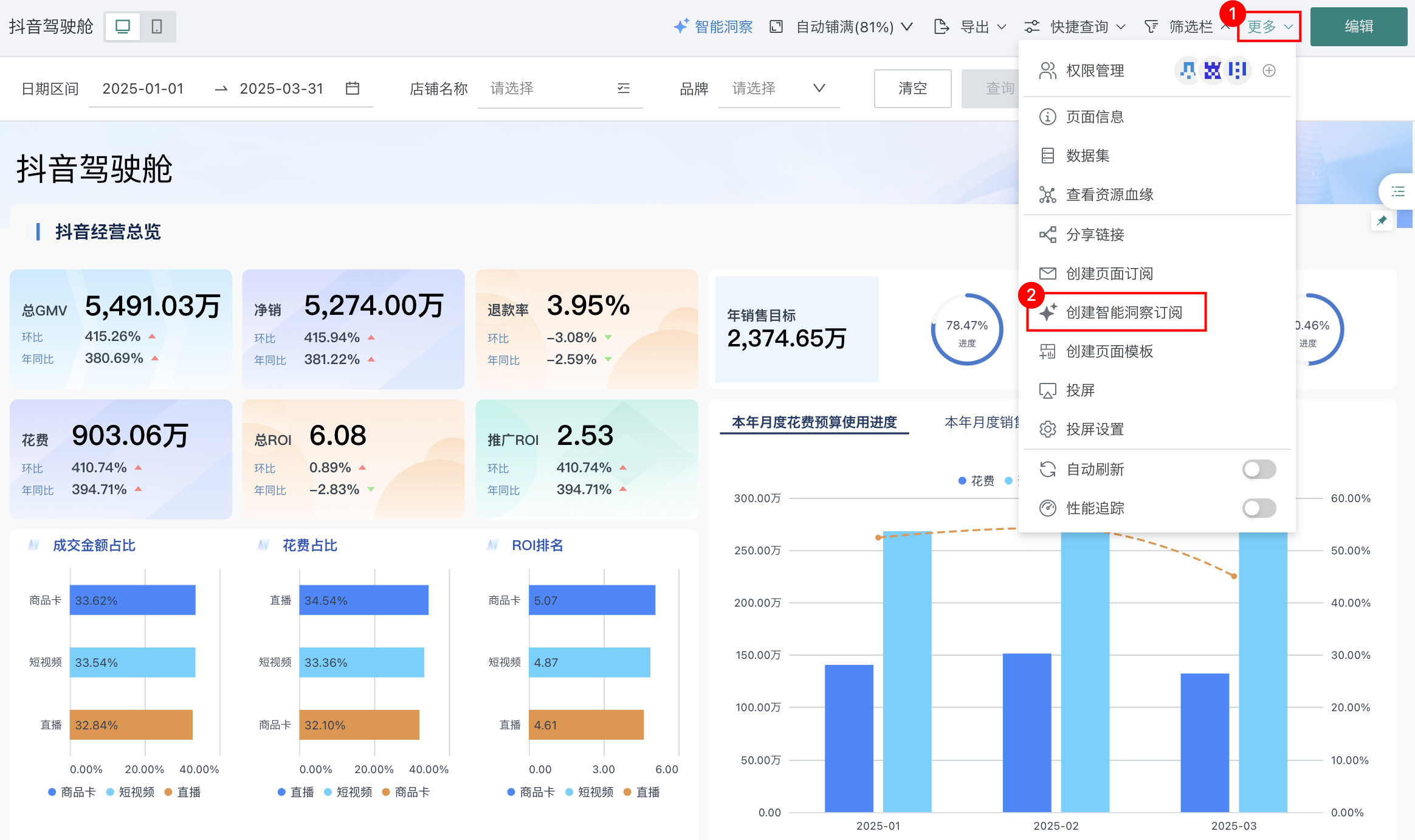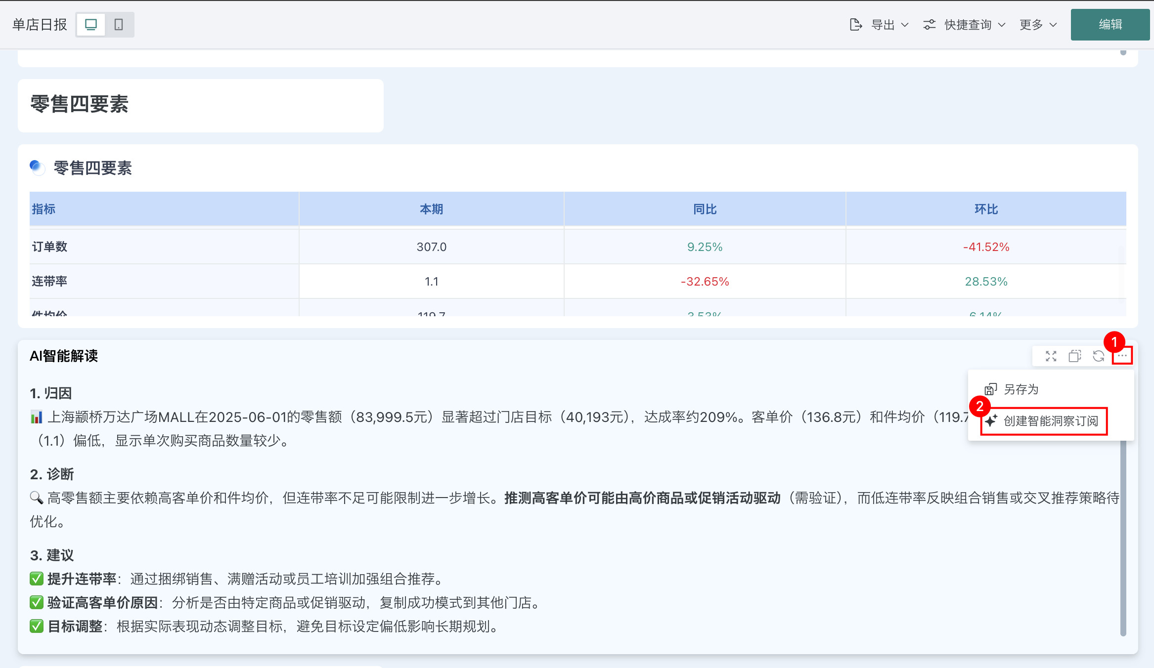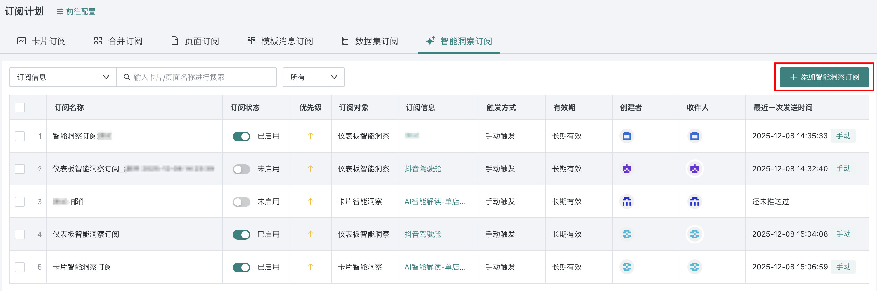对已开启「仪表板智能洞察」的页面,创建订阅有如下两个入口: