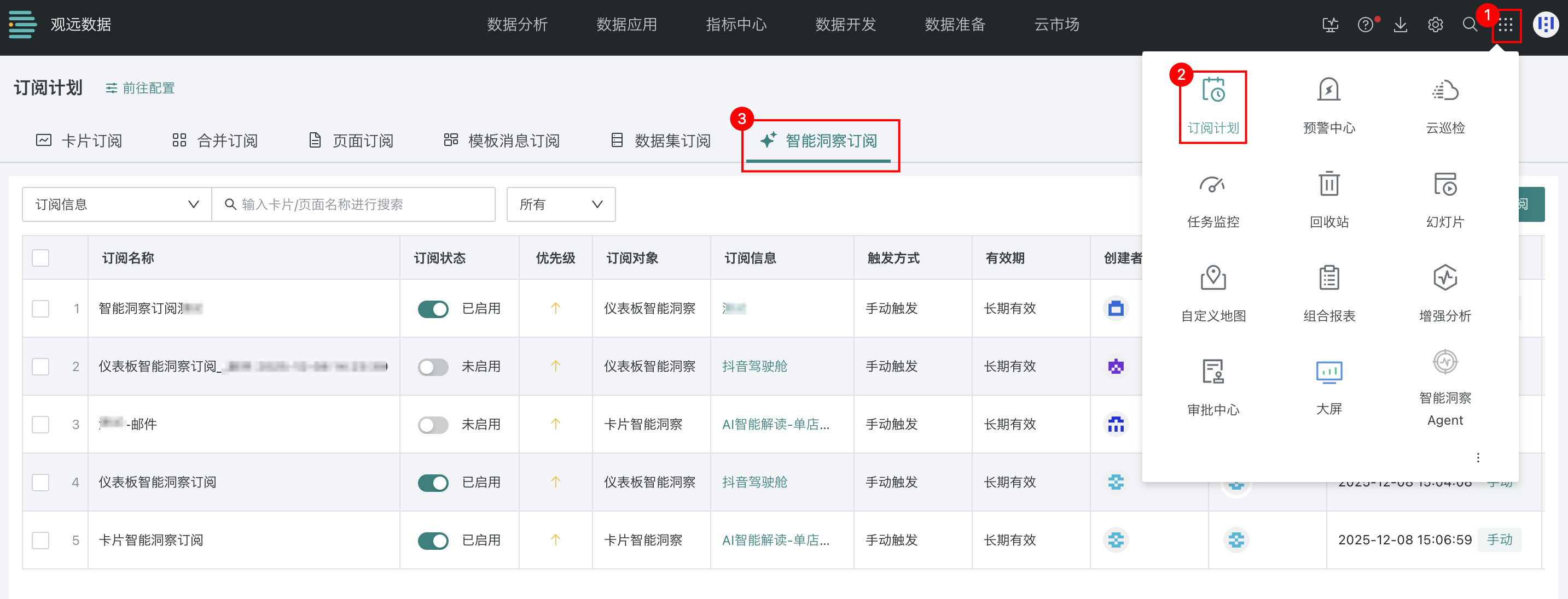 - 点击右上角九宫格,选择「订阅计划 > 智能洞察订阅」。