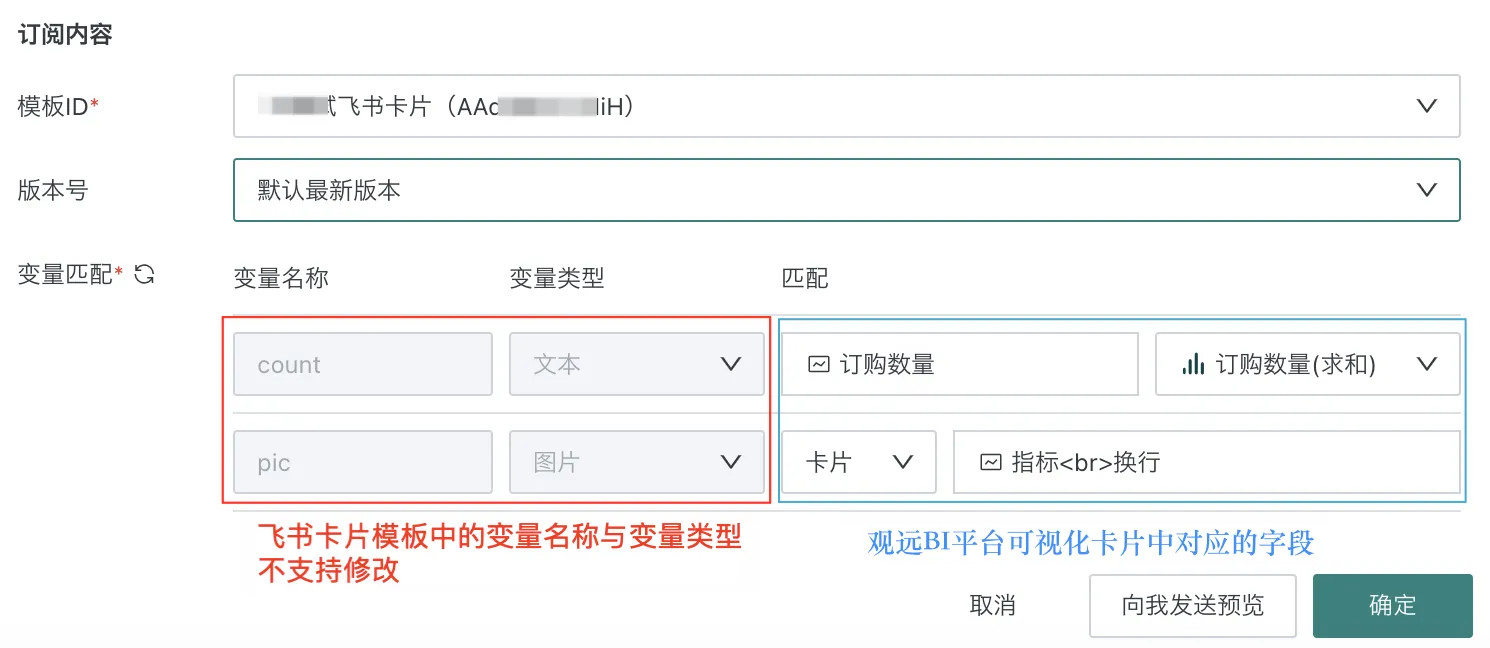 飞书集成优化:配置模板消息订阅预警时,自动获取飞书中用户配置完成的卡片模板ID、版本号及变量信息,减少手动输入误差,提高配置效率,详见飞书模板消息订阅。