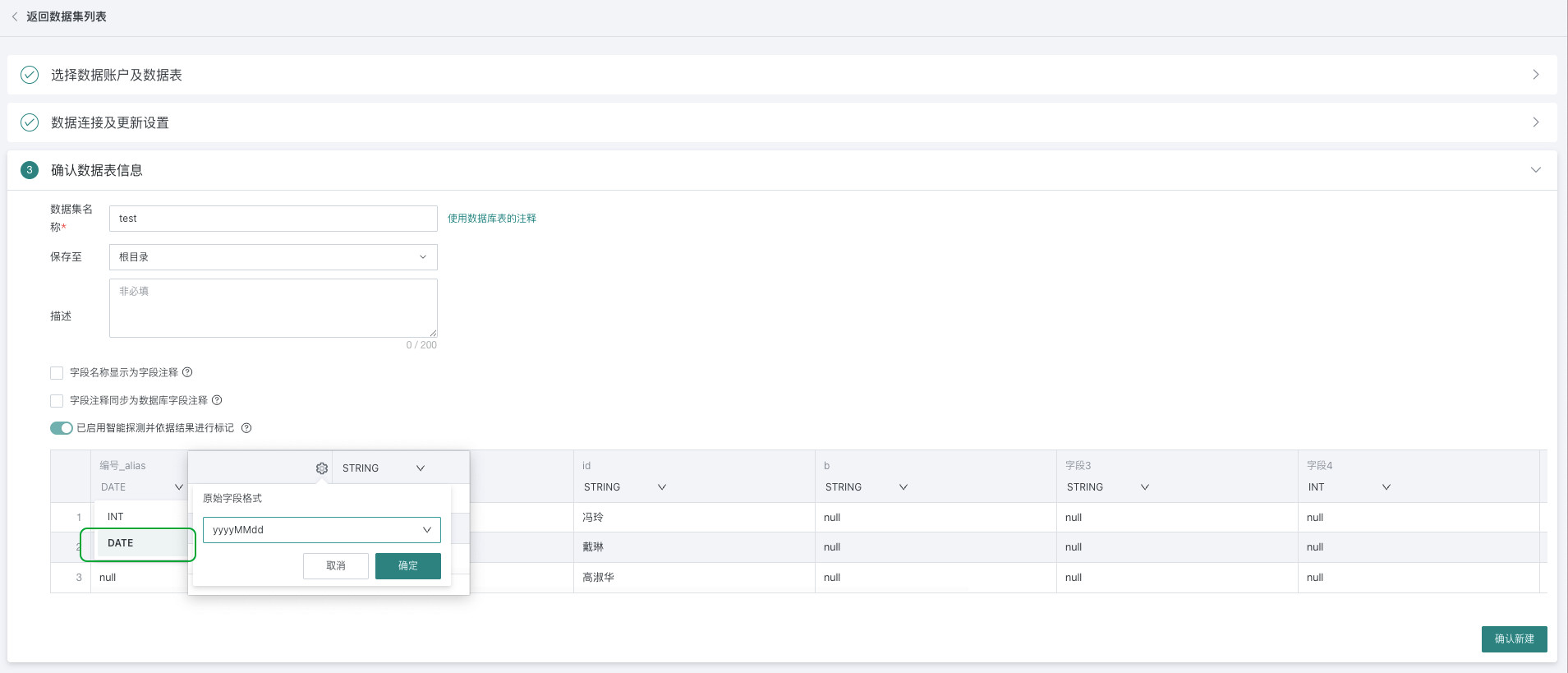 数据集层面支持指定 INT 类型字段设置「识别为日期」:用户在数据库中可能把日期类型存储为 INT 类型,在 BI 平台连接数据库时,在「确认数据表信息」这一步骤最后一步预览信息时,支持将 INT 类型切换为日期类型,切换成日期类型后需要点击右侧小图标选择日期格式。