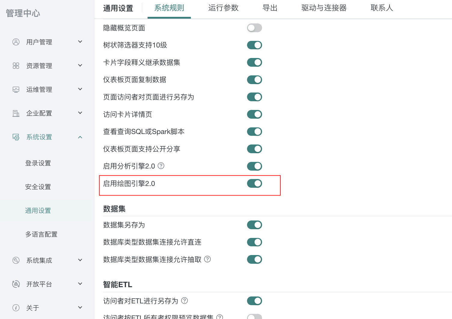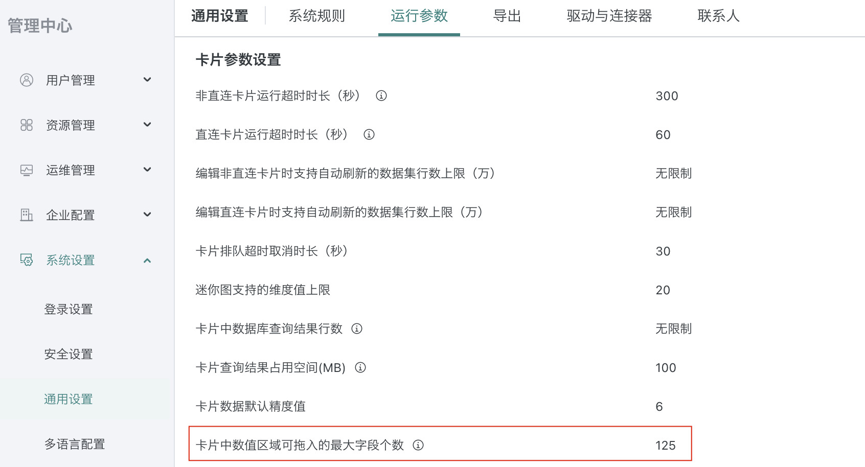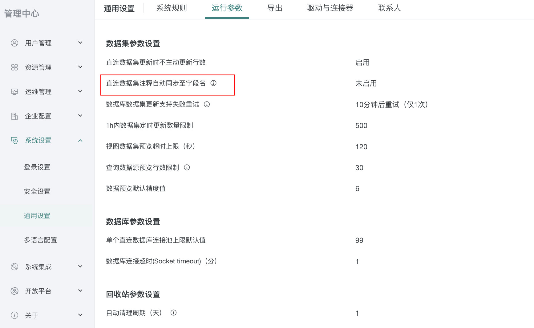 直连数据集注释自动同步至字段名:直连数据集数据结构更新时,触发数据注释更新,并自动同步到字段名,若注释名为空时则不覆盖原有字段名,此功能需要在「管理员 > 通用设置 > 运行参数 > 数据集参数设置」中开启,默认为关闭状态。