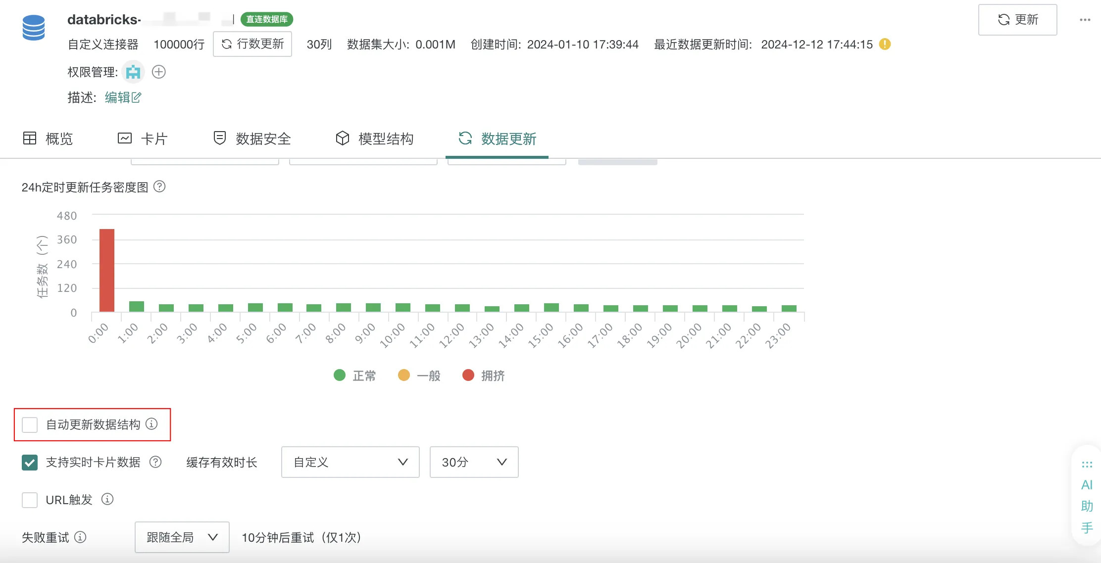 直连数据集支持自动更新数据结构:DB 类型直连数据集开启调度状态后,可选择是否自动更新数据结构。如选择自动更新,则每次定时更新缓存/ URL 触发之前先更新一次数据结构,详见直连数据集自动更新数据结构。