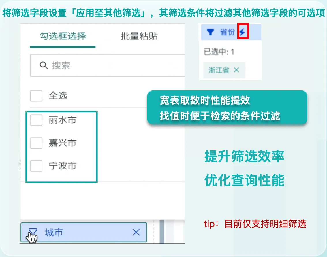 卡片编辑页支持按条件过滤筛选字段的可选项:在卡片开发过程中,通过在筛选区域将字段设置「应用至其他筛选」,此后每次添加筛选条件,系统会优先基于该筛选字段进行数据匹配,过滤其他筛选字段可选项,在大数据量的情况下提高数据筛选效率(例如:将「省份」设置为筛选字段并勾选「应用至其他筛选」,筛选「浙江省」后,再添加「城市」字段,直接定位到「浙江省」下的城市)。详见应用至其他筛选。
