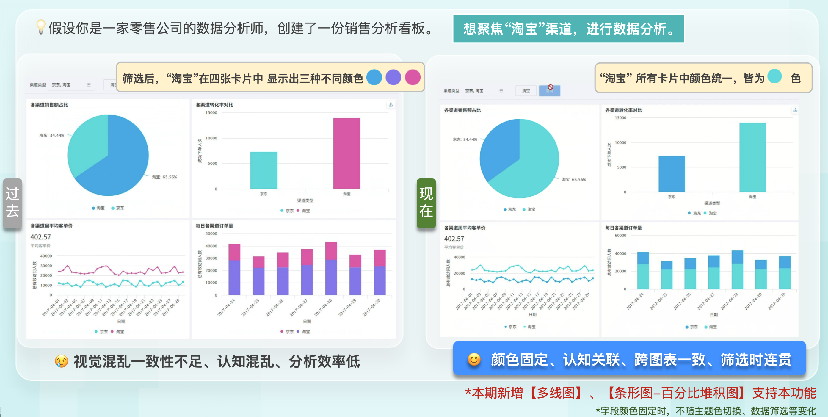 字段颜色绑定范围增强:字段颜色绑定功能本次新增了多线图与条形图-百分比堆积图。将字段与颜色绑定后,在看板首页进行筛选时,同一字段在不同图表中的颜色固定,视觉效果统一,若未绑定将会导致视觉效果混乱,影响分析效率。颜色功能详见图表绘制-颜色。