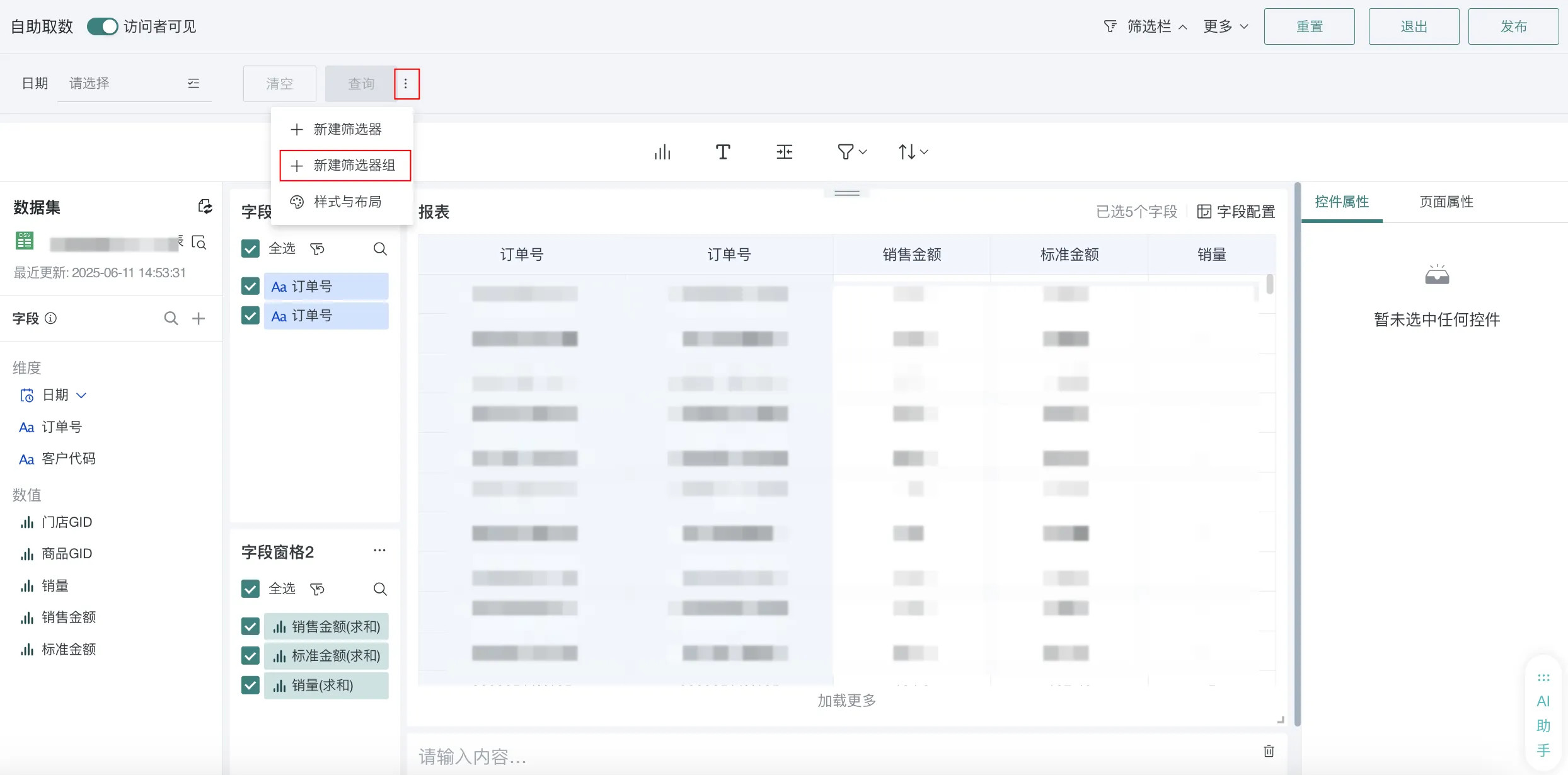 - 更多图表支持筛选器组:自助取数、自定义列表支持筛选器组,提升筛选栏的整洁度、以及用户定位筛选器的效率,详见管理自助取数。