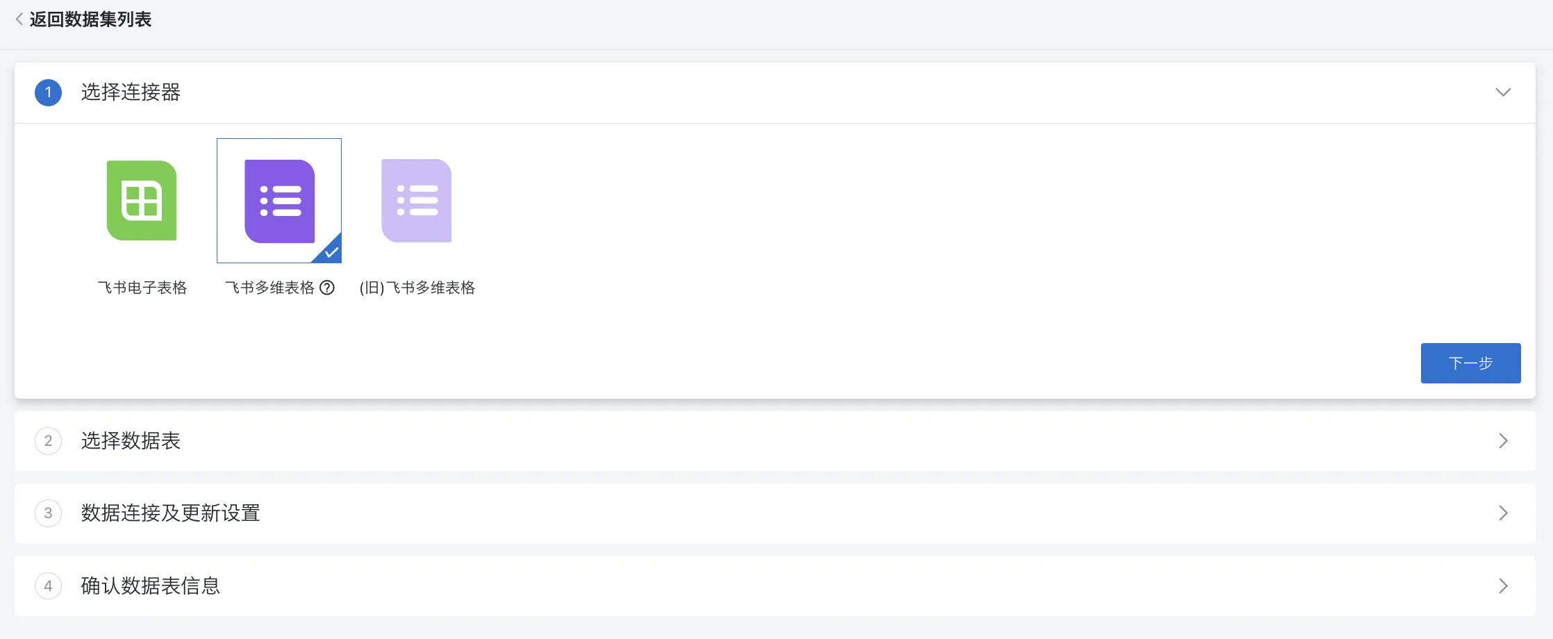飞书多维表格支持对接新接口:在线文档增加数据集类型 「飞书多维表格」,使用新接口;原飞书多维表格更名为「(旧)飞书多维表格」,仍使用旧接口,详见在线文档。