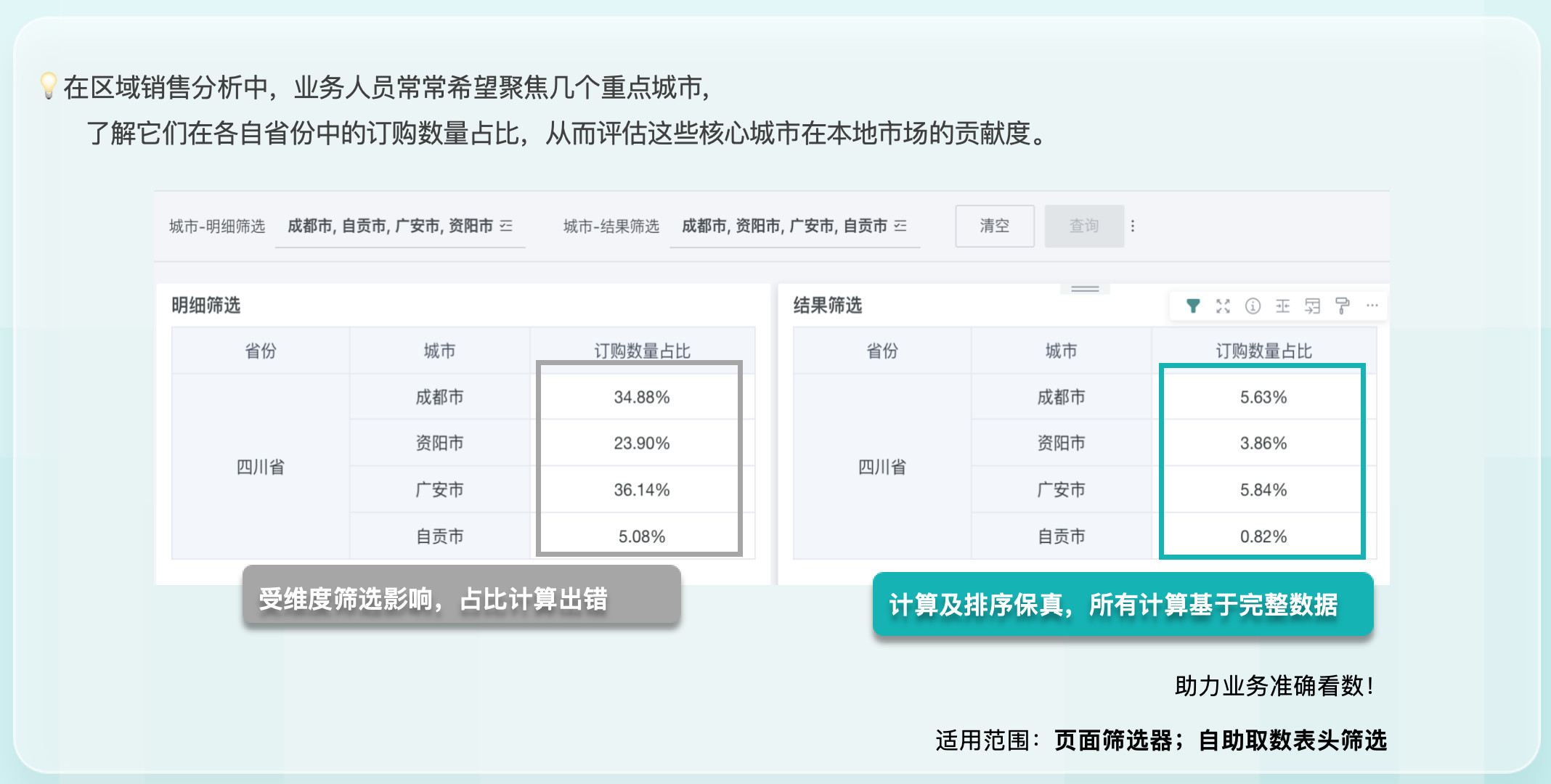 维度支持结果筛选:完善筛选能力,助力业务高效看数。将维度字段设为「结果筛选」时,只对结果进行筛选,不影响计算。