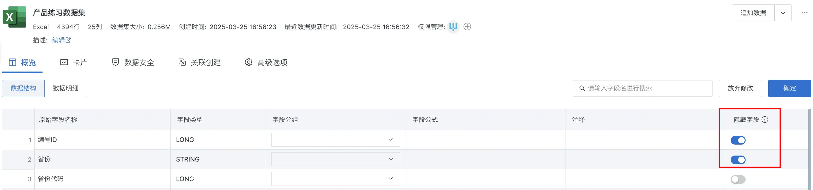 数据集支持隐藏字段:支持将不想透出的或者冗余的字段设置为隐藏字段,隐藏字段无法在卡片使用,提升数据集使用的安全性和易用性,详见隐藏字段。
