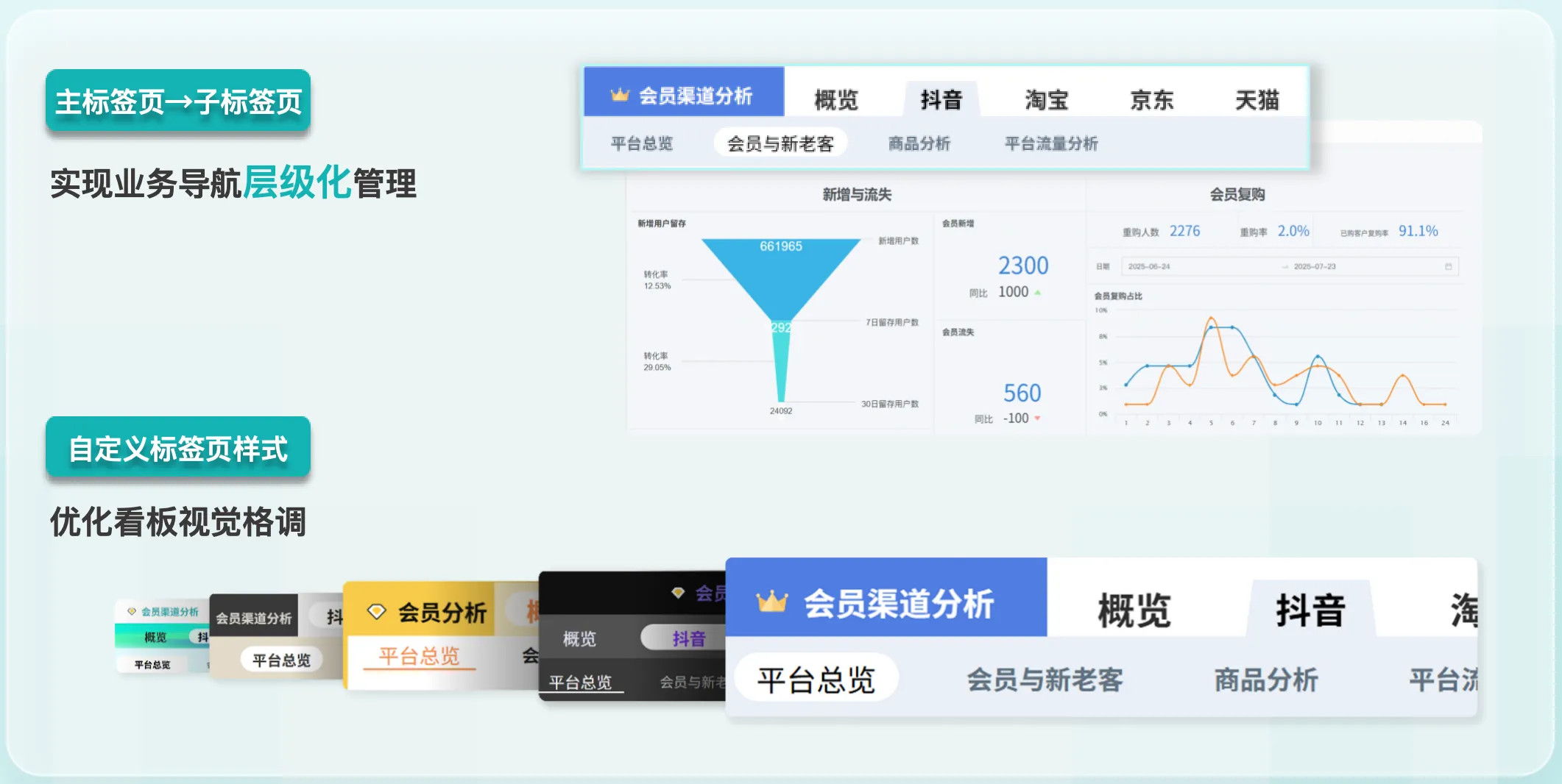 标签页支持嵌套以及样式自定义:支持标签页嵌套,可按业务逻辑实现层级化梳理,让复杂的多维度交叉分析场景导航更清晰,大幅减少操作路径,快速定位所需分析内容;同时标签页样式支持自定义配置,不同业务场景可搭配专属样式(如颜色、布局等),既能强化场景辨识度,也能优化视觉体验,详见标签页。