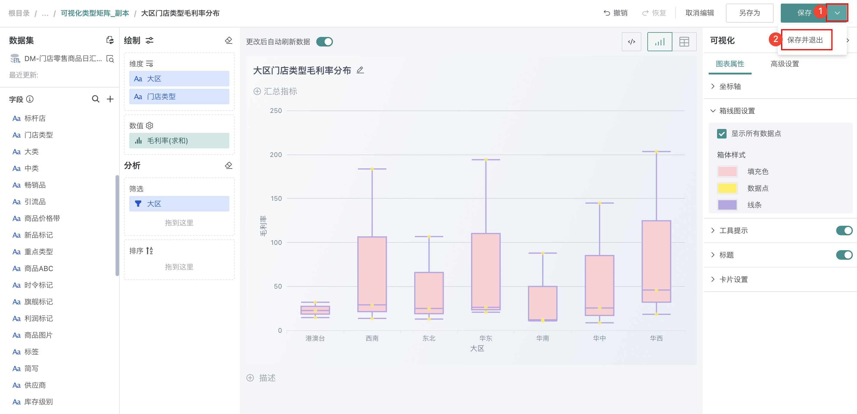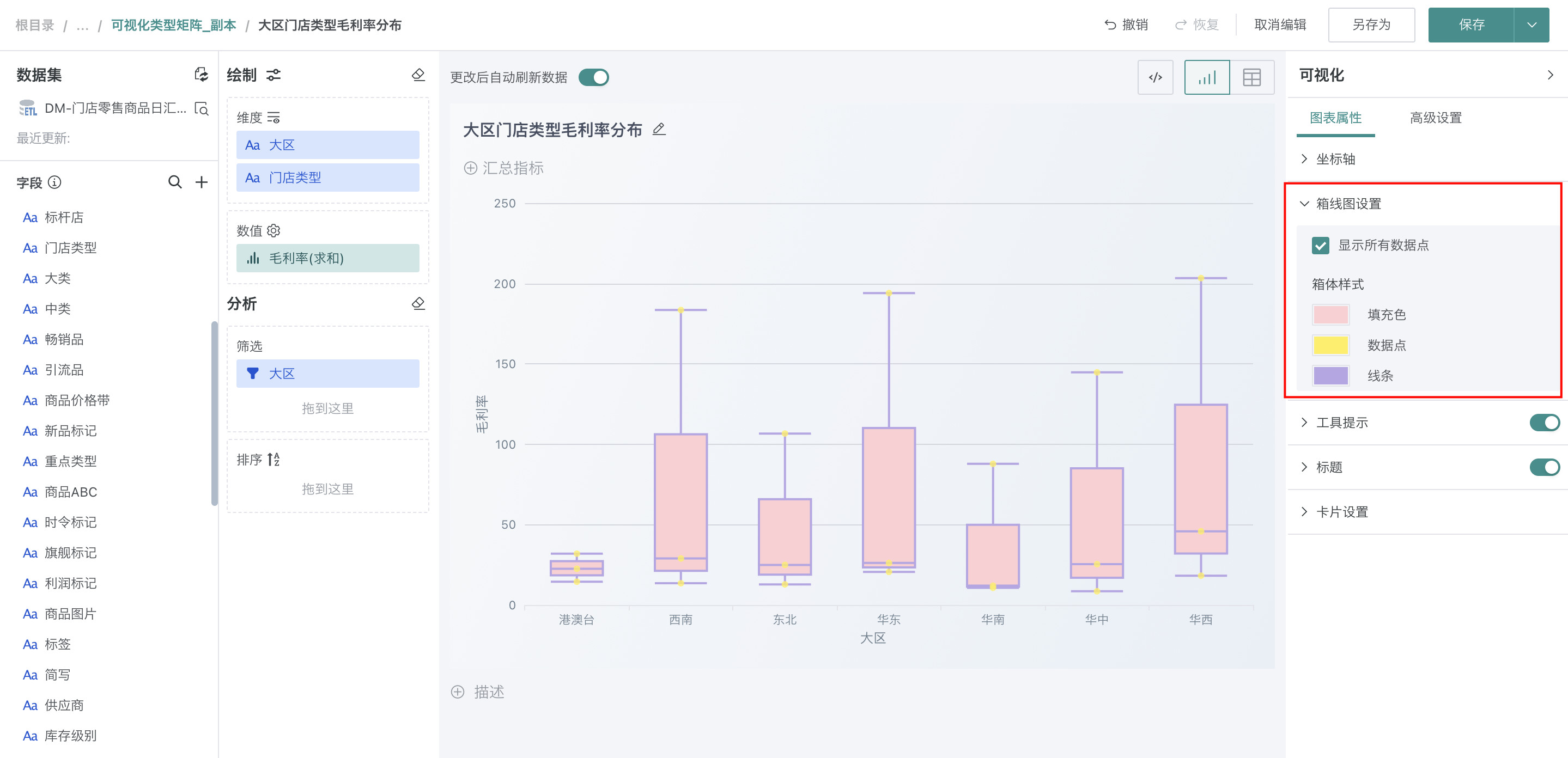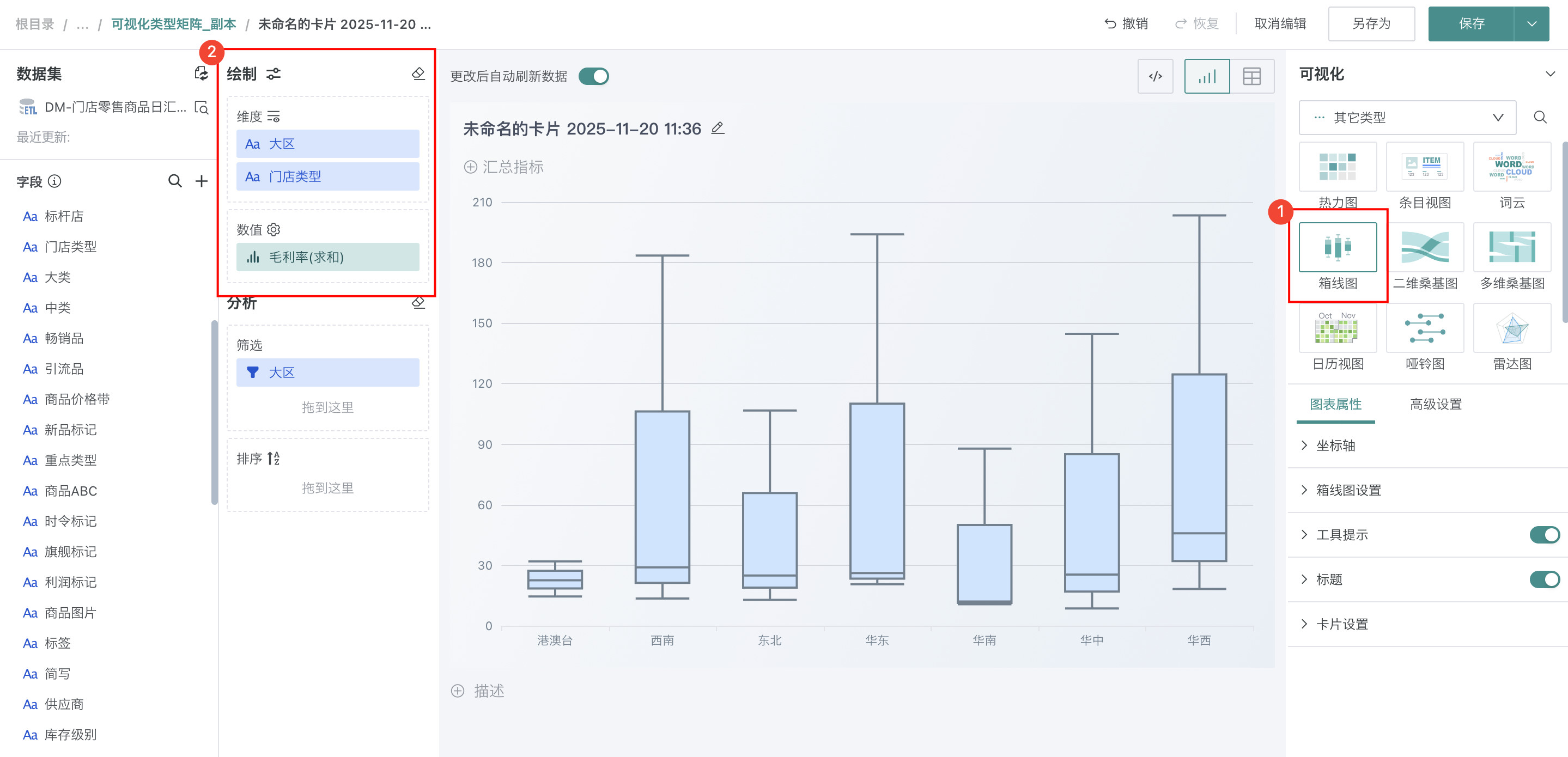 在「可视化」区域中选择「箱线图」,将左侧「数据集」区域的「大区」和「门店类型」拖至「绘制」区域的「维度」,「毛利率」拖至「数值」。