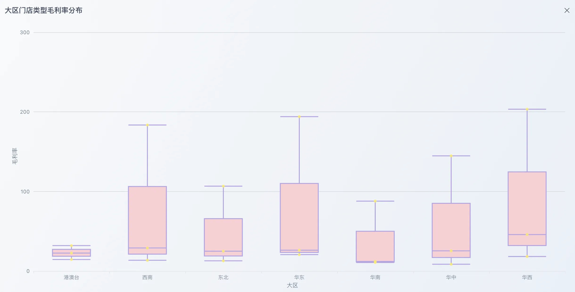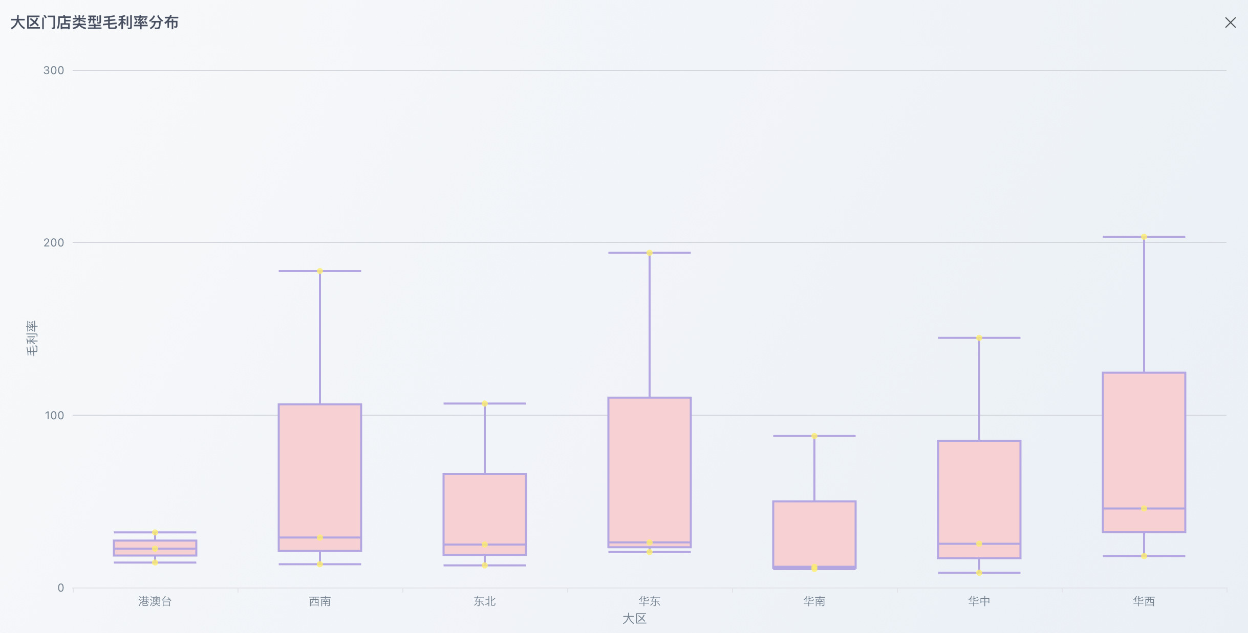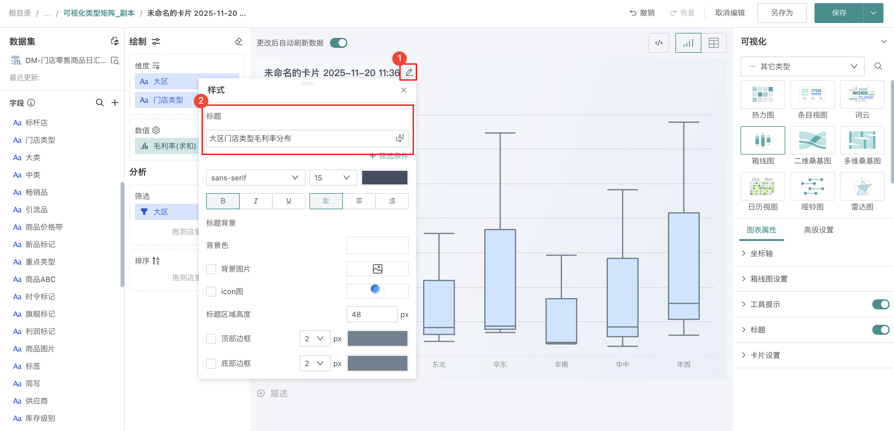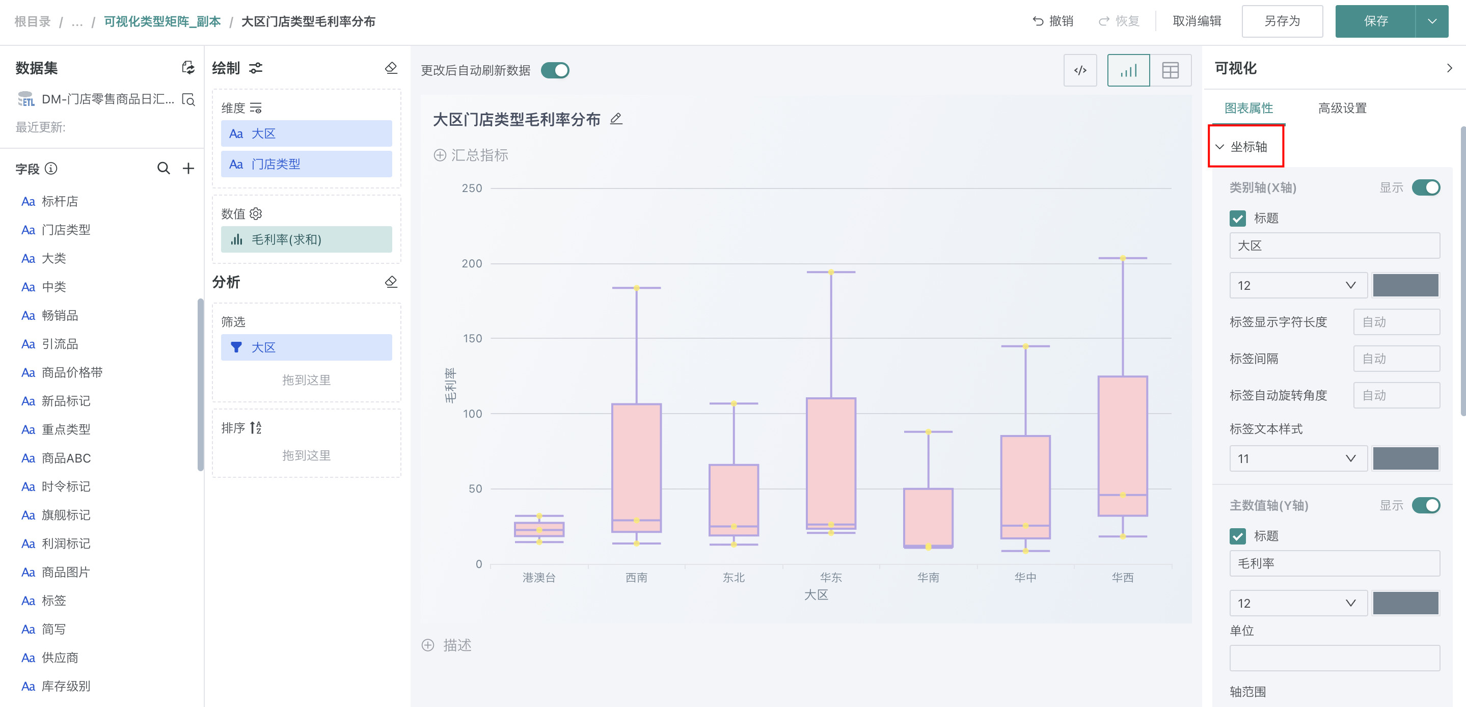 在「可视化」区域中选择「箱线图」,将左侧「数据集」区域的「大区」和「门店类型」拖至「绘制」区域的「维度」,「毛利率」拖至「数值」。