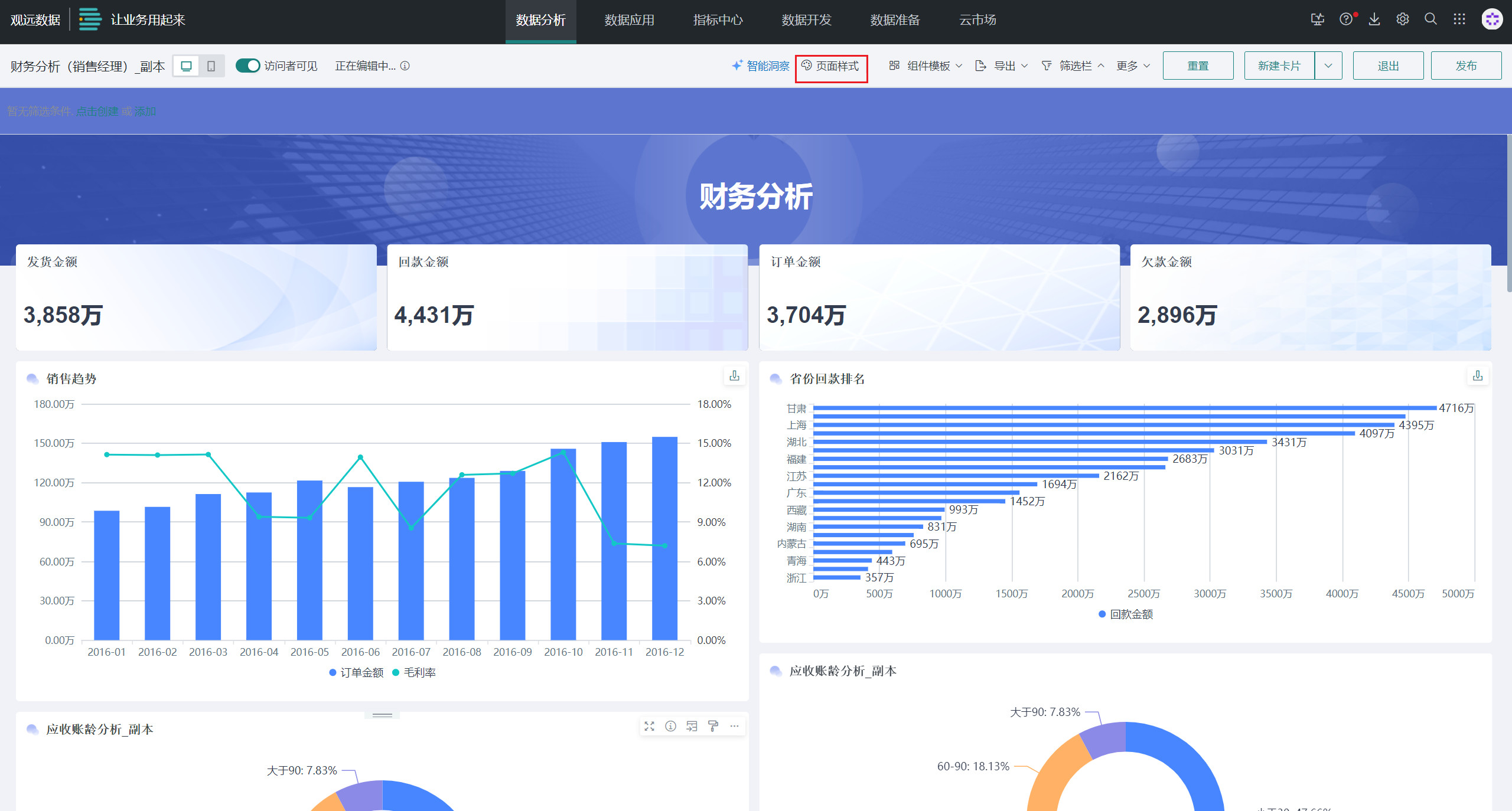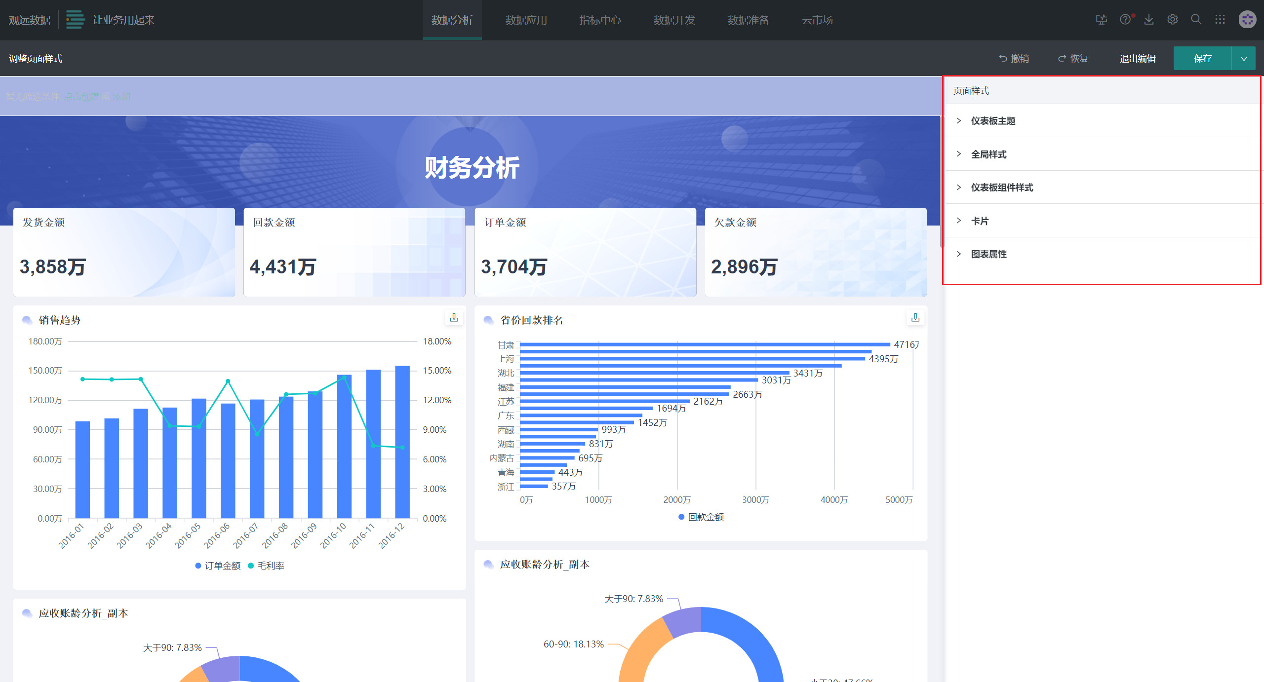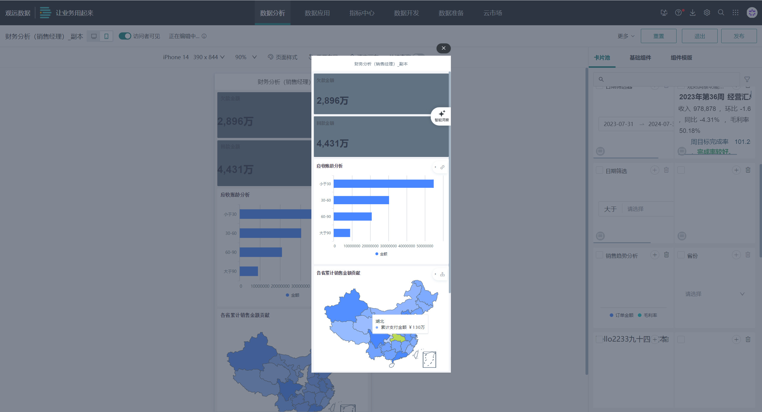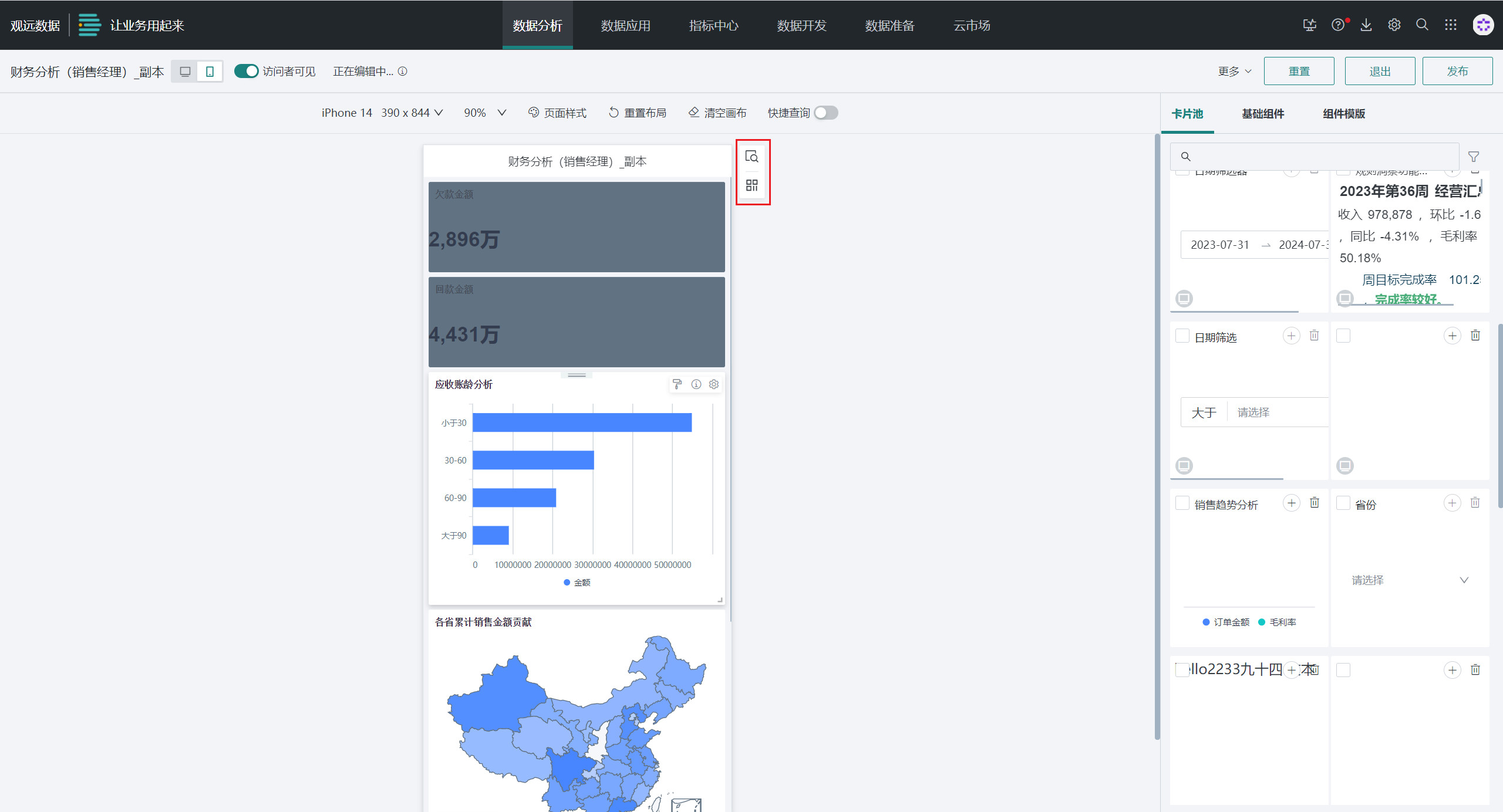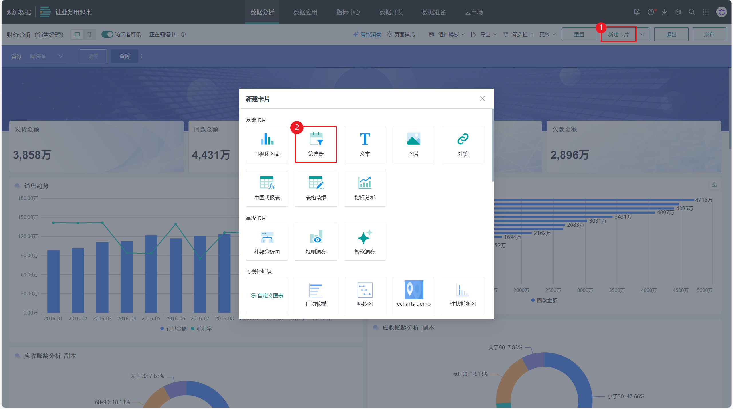 仪表板是观远BI平台的核心功能之一,它允许用户将多个可视化图表、文本说明等基础卡片、智能洞察、杜邦分析图等高级卡片及自定义图表和筛选器组合在一个页面中,形成完整的数据驾驶舱。