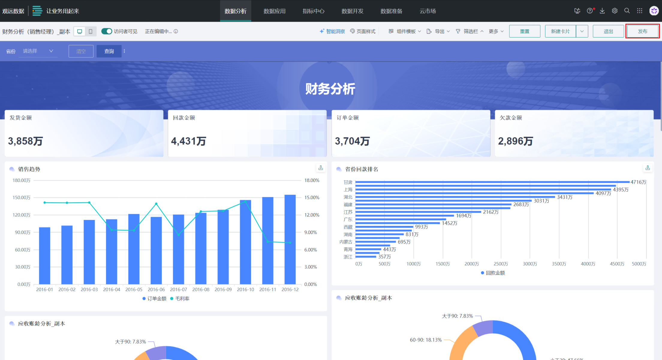 仪表板配置完成后,点击右上角「发布」按钮,完成仪表板创建。