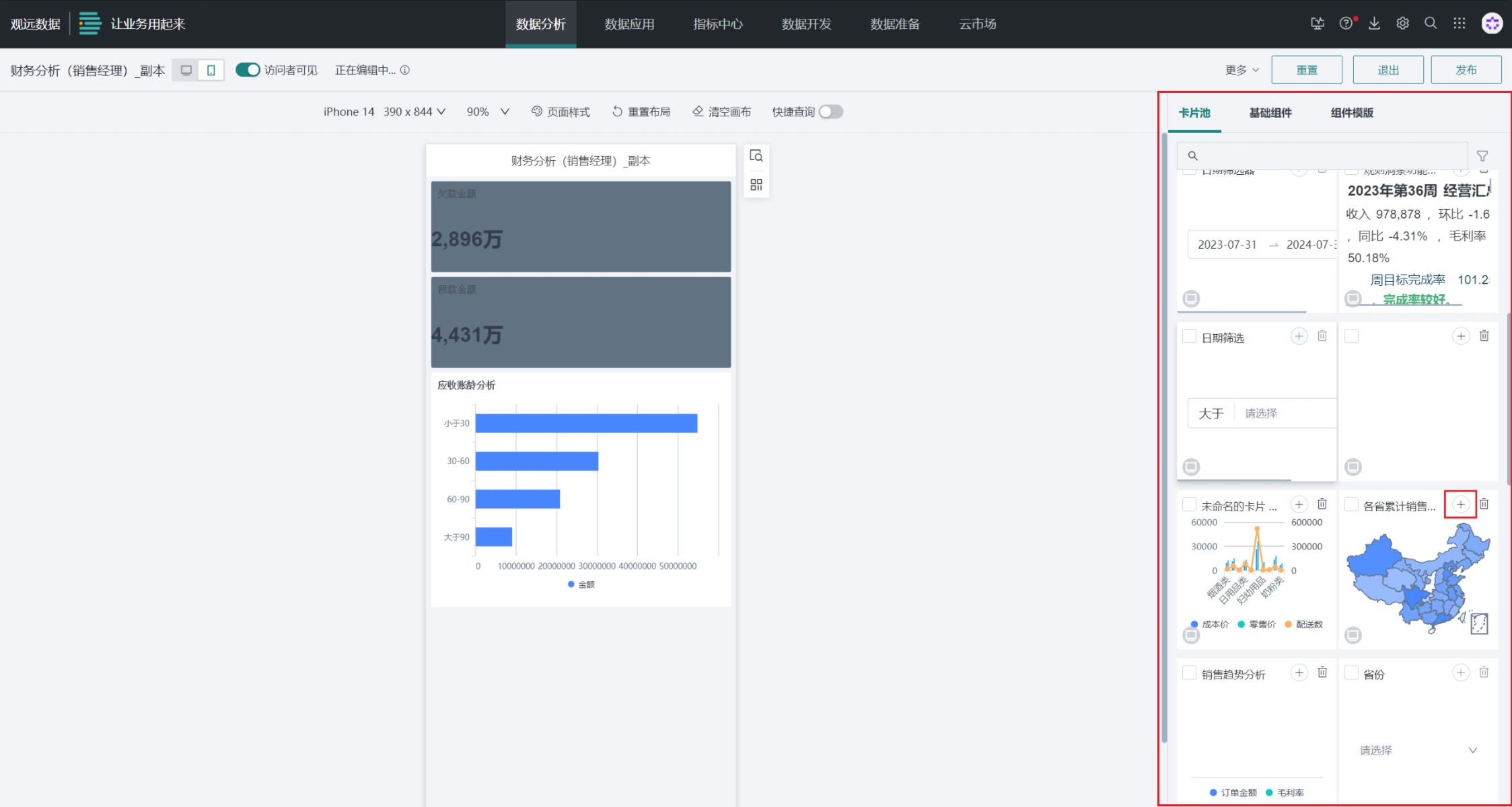 在右侧「卡片池」中点击所需卡片右上角的「+」,添加所需卡片至移动端仪表板。