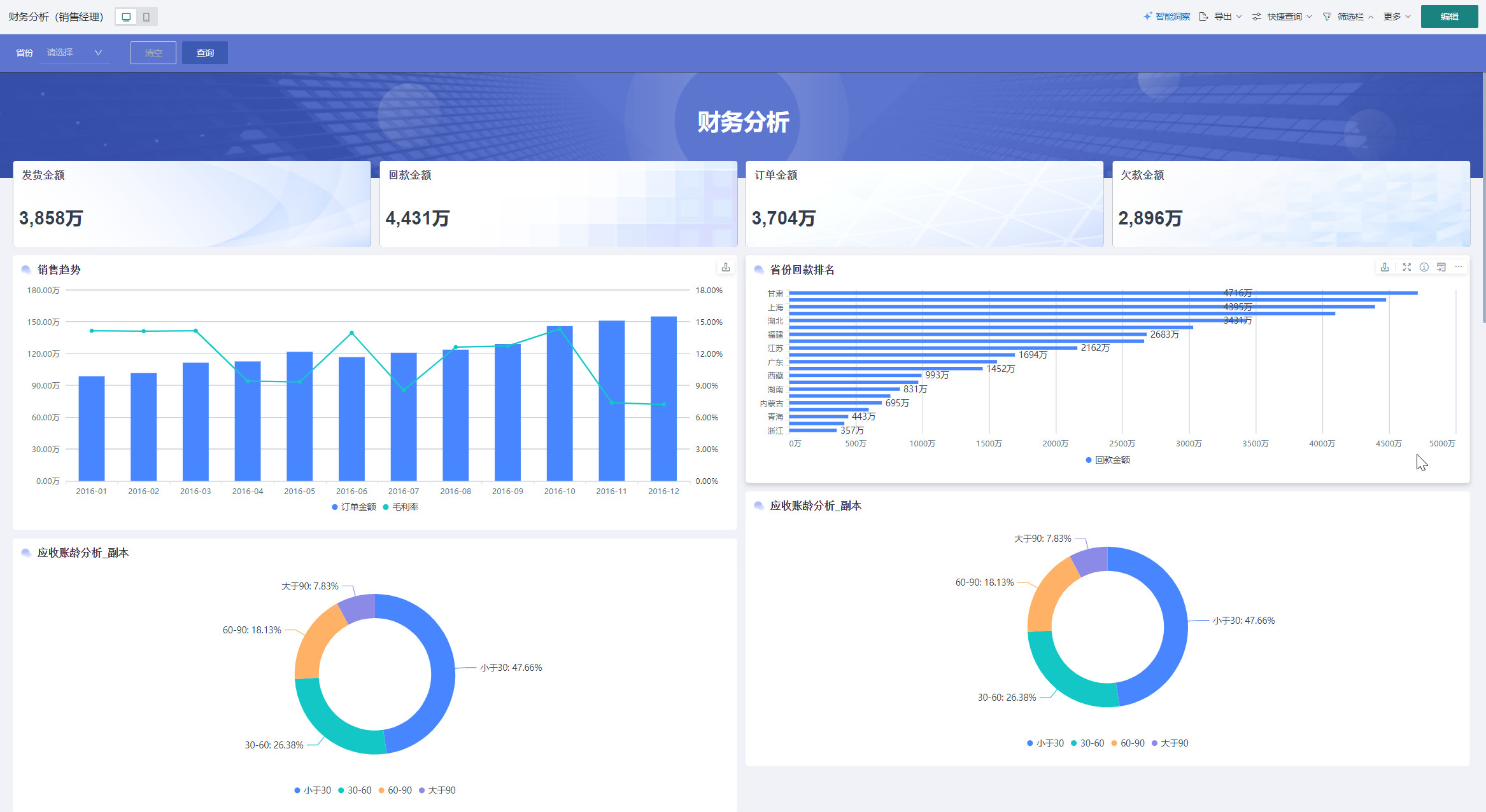 - 多种组件:集成丰富的可视化图表、文本、图片、筛选器等组件