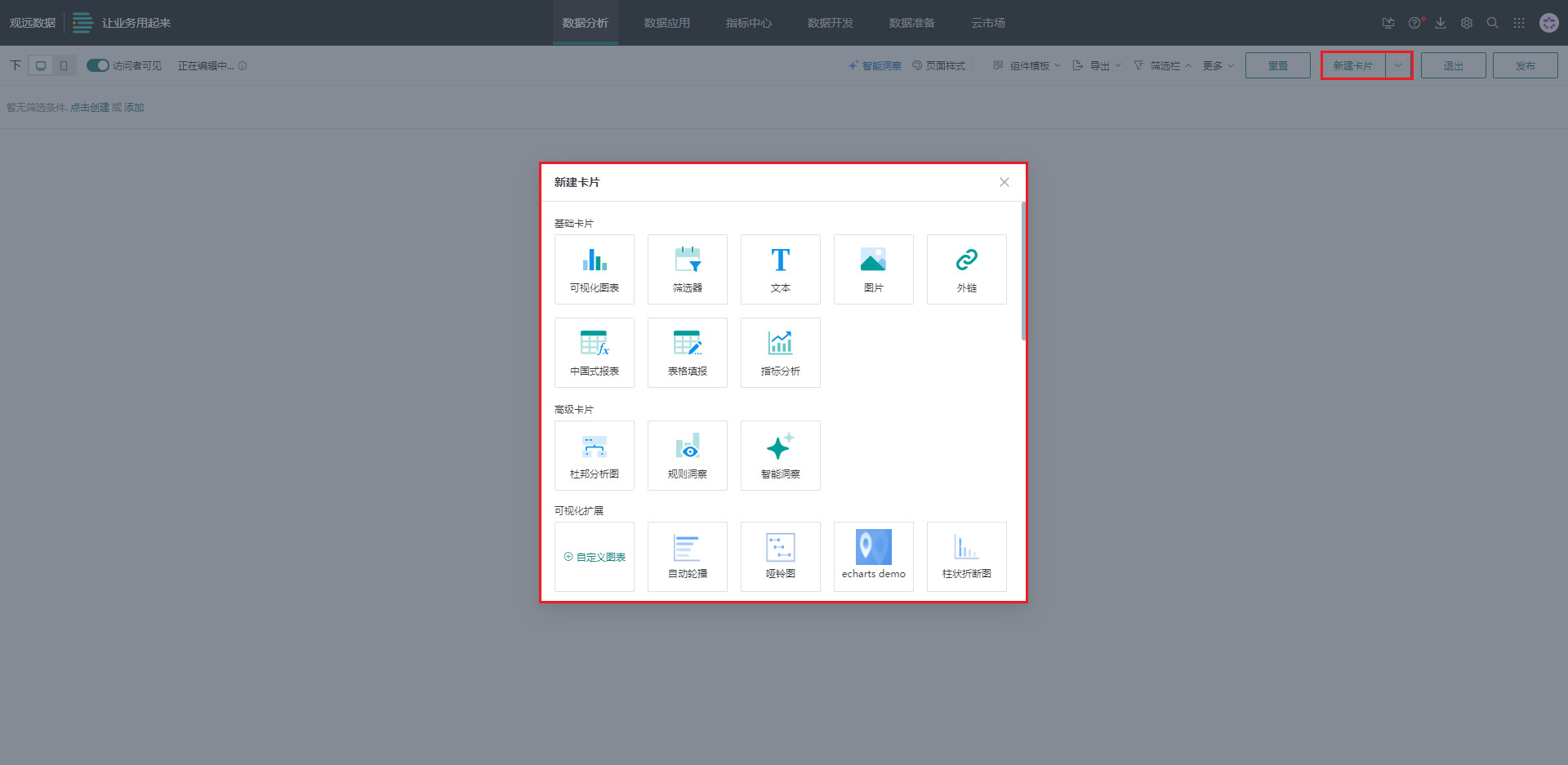 点击「新建卡片 > 可视化图表或其它卡片」,新建所需卡片,点击「发布」即可发布。