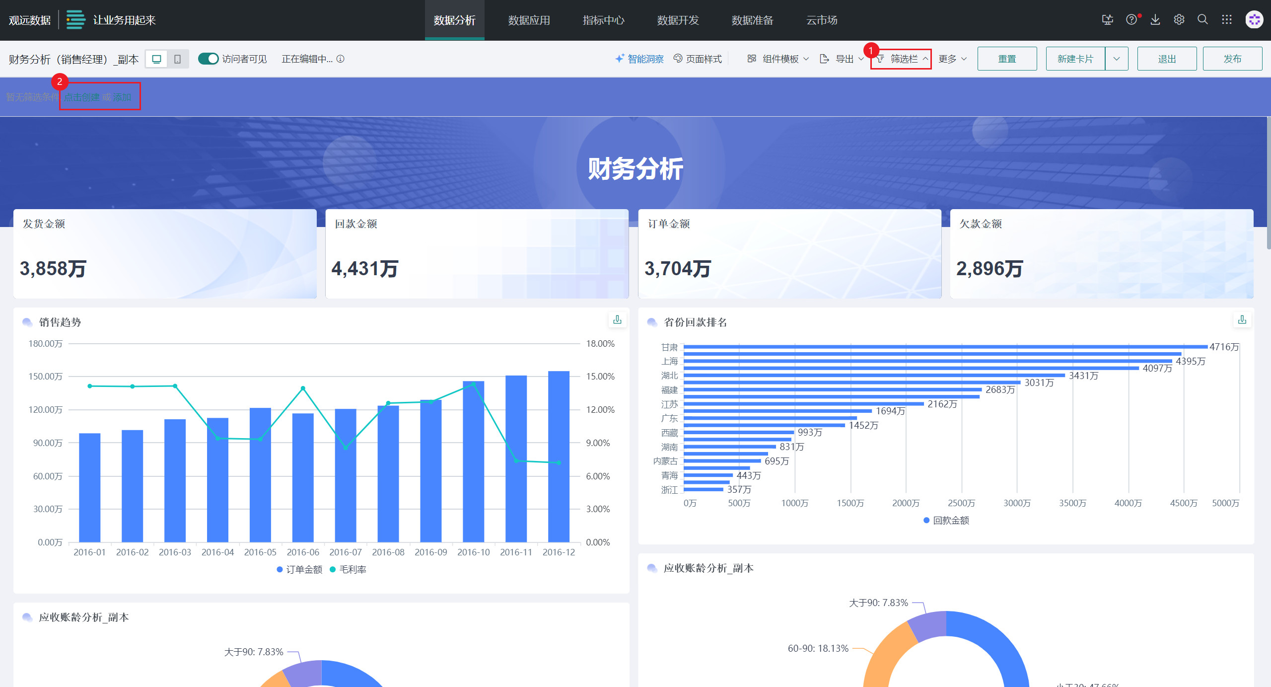 观远BI的筛选器功能允许用户在查看仪表板时灵活调整过滤条件,实现对多个组件的同时过滤。
