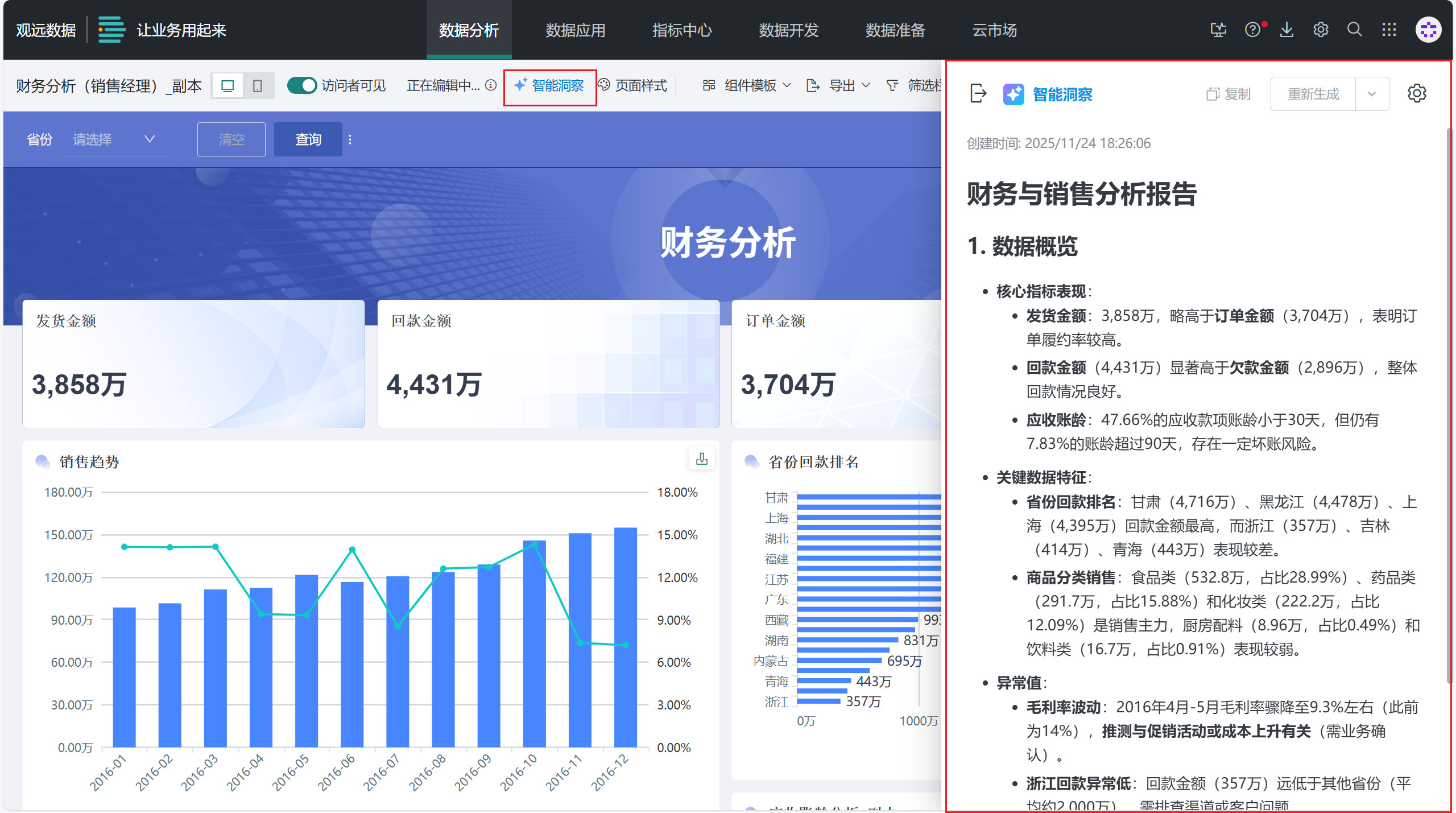 仪表板智能洞察通过AI自动解析仪表板数据,一键识别异常波动、隐藏关联与业务机会,为用户提供可视化之外的深度洞察与可行动建议。详见仪表板智能洞察。
