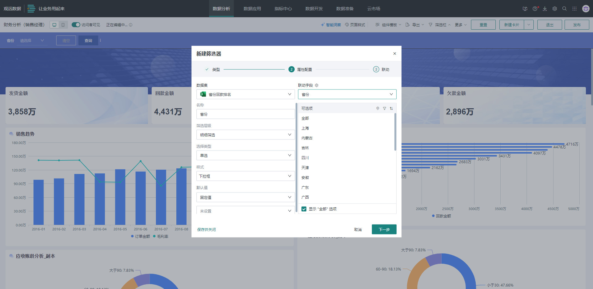 选择合适筛选器后进行「属性配置」和「联动」,即可添加筛选器。